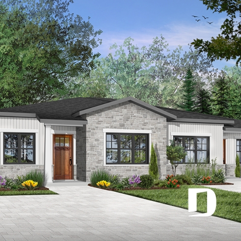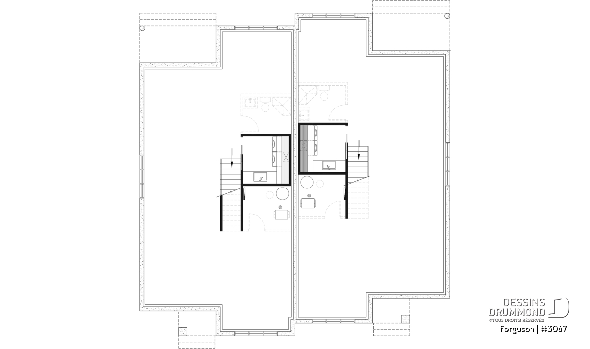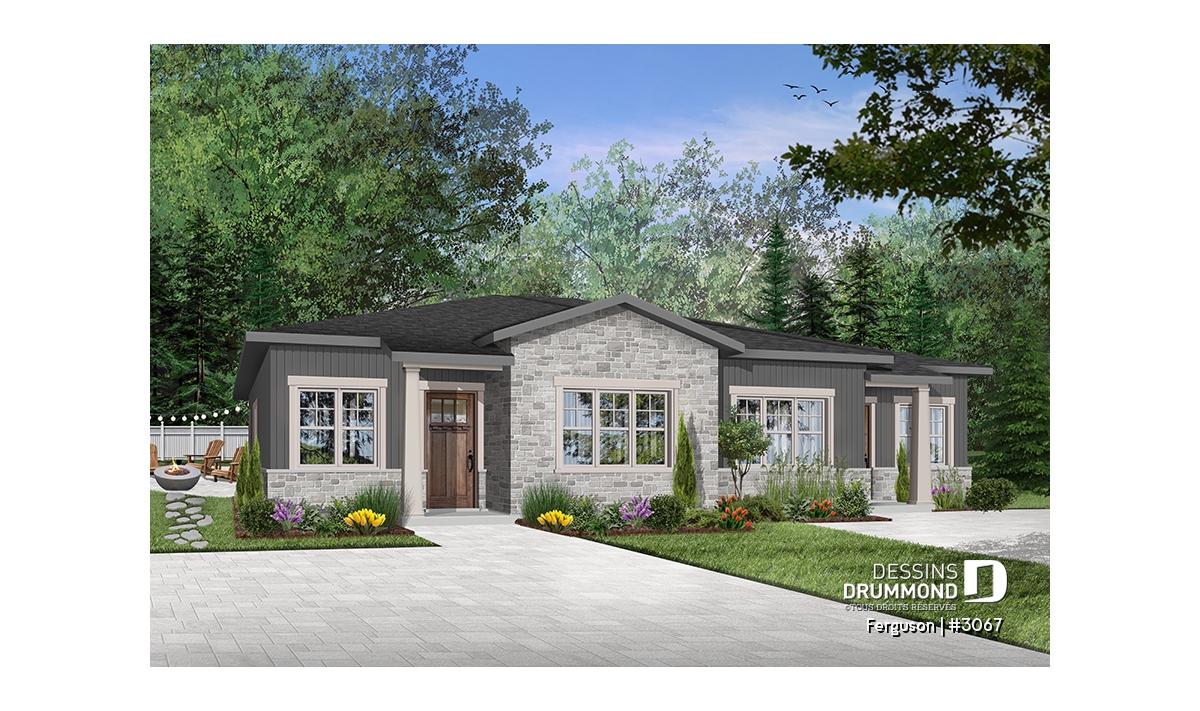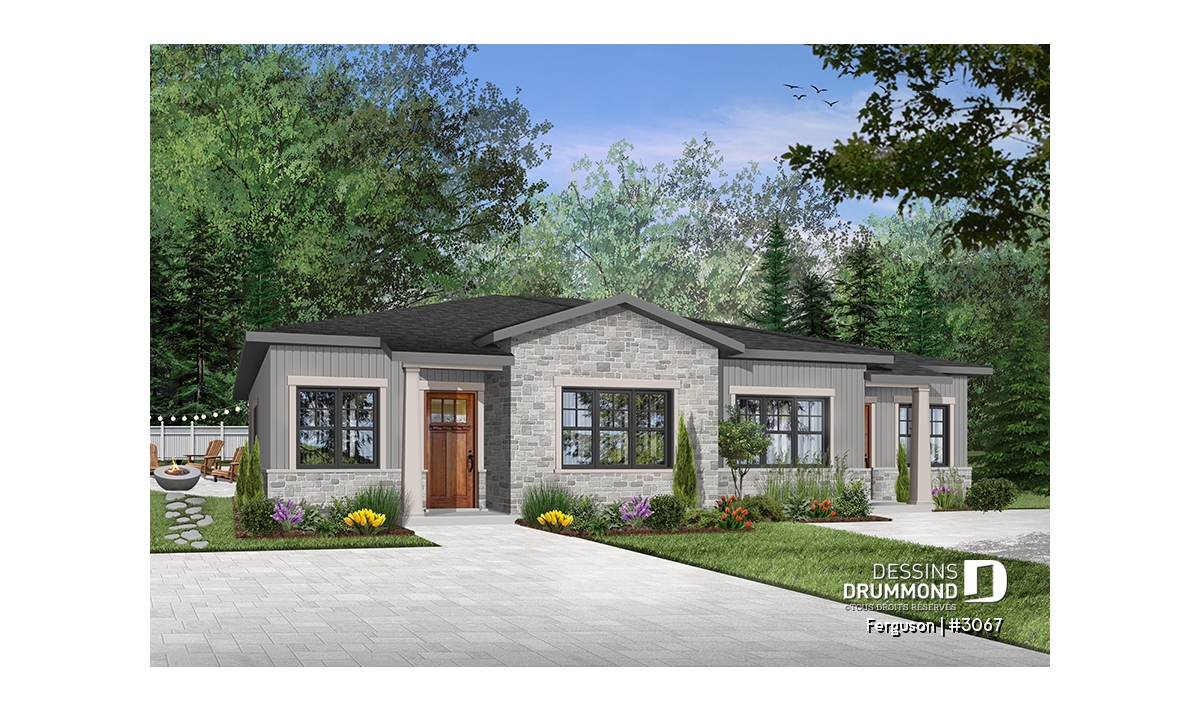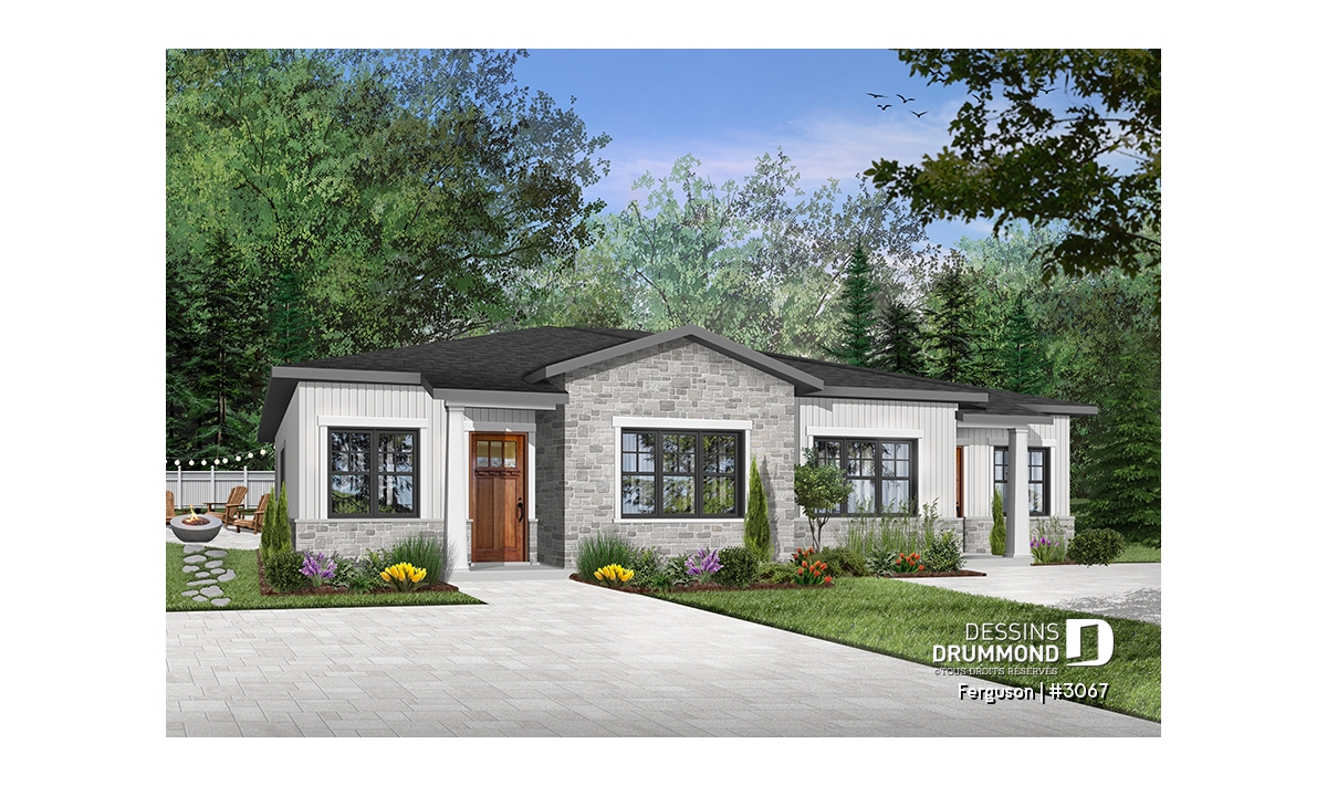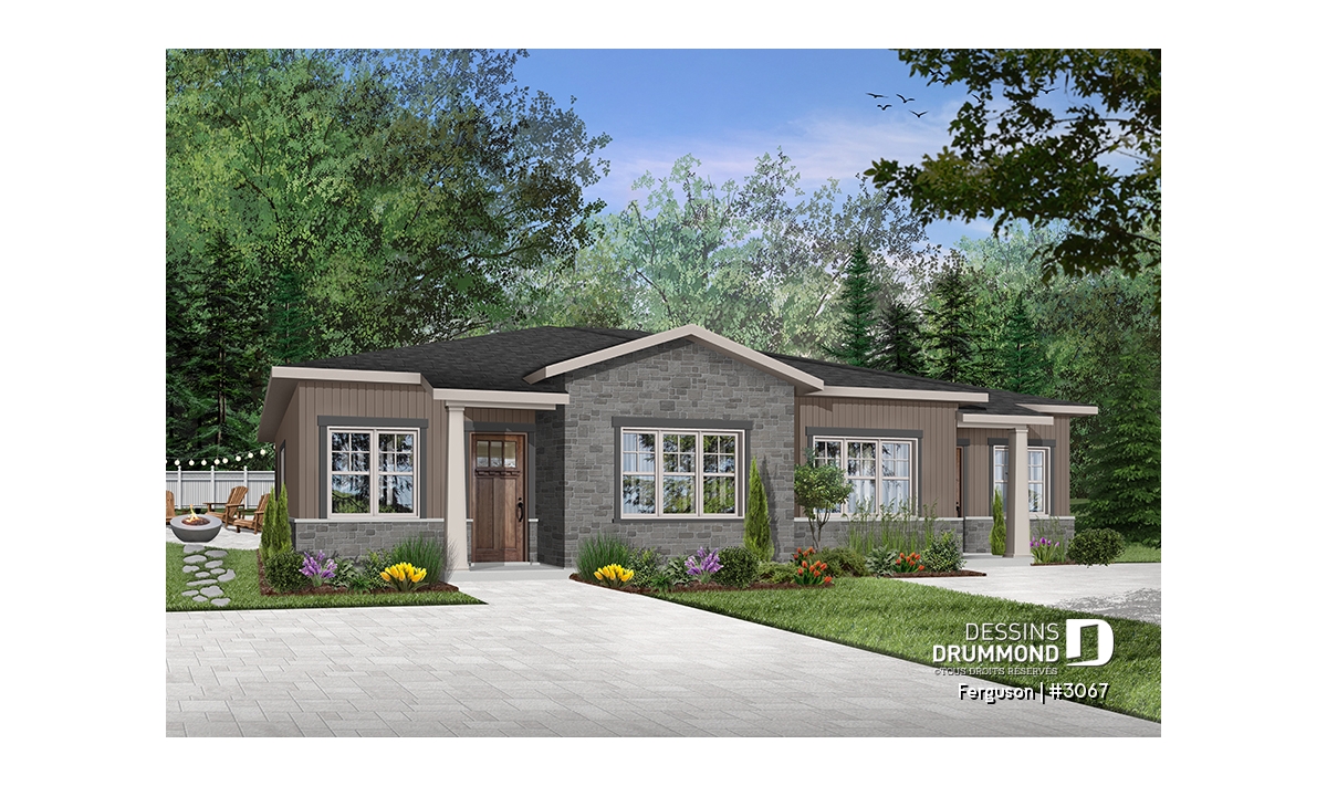 Voici un modèle de jumelé de style américain, le plan FERGUSON # 3067 de Dessins Drummond, vous offrant de beaux espaces et du confort! Le modèle Ferguson a été pensé initialement pour un couple ou famille souhaitant ne pas avoir de sous-sol ce qui nous permet de récupérer l’espace prévu pour un escalier (menant au sous-sol) et d’ainsi maximiser le pied carré global. Il est à noter que le plafond du rez-de-chaussée est à 9 pieds partout, ce qui donne une amplitude non négligeable aux pièces. Une option avec sous-sol à aménager est cependant disponible ($).