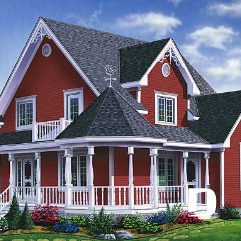 Plan de maison champêtre, à étages, 3 chambres avec plafond cathédrale, jolie finition extérieure