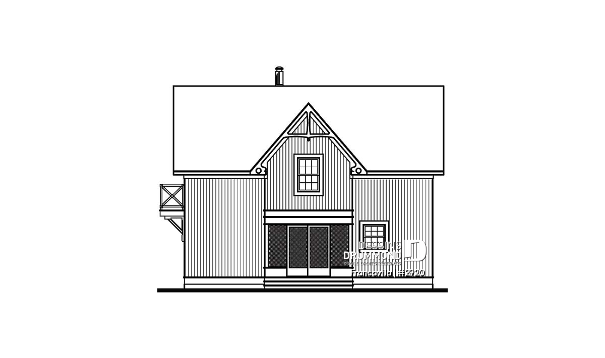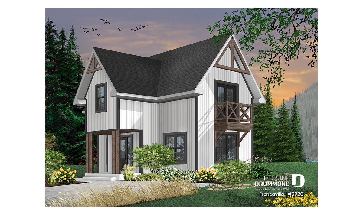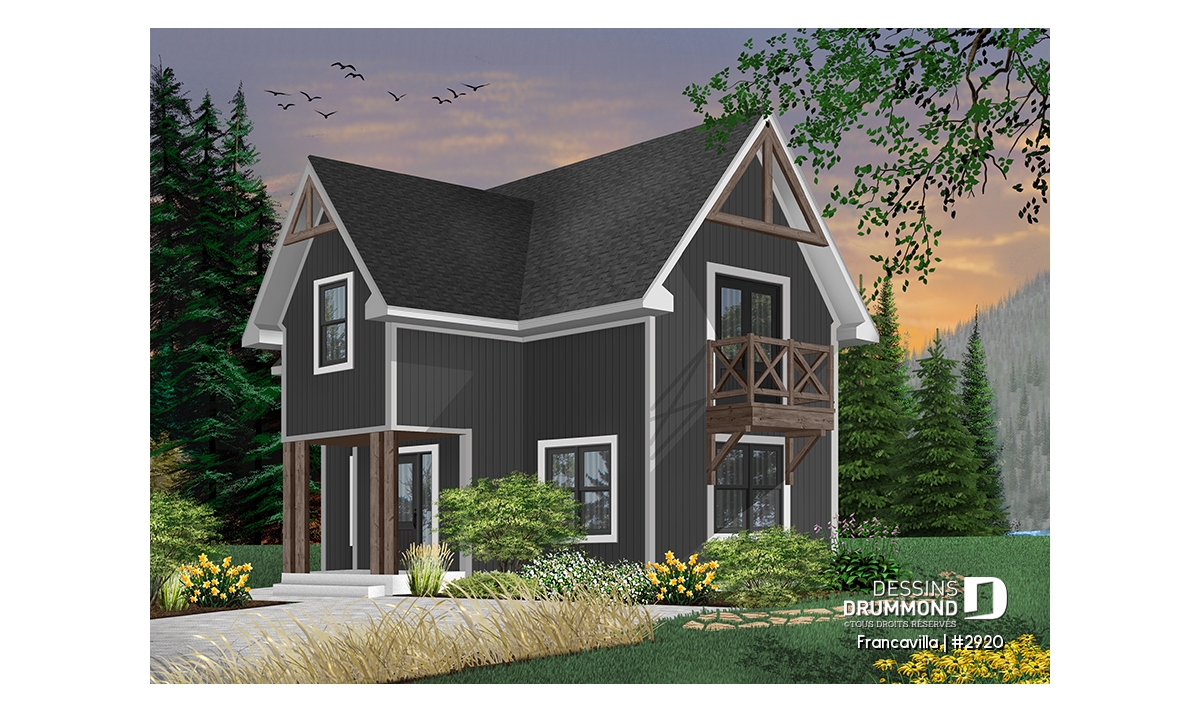 Plan de chalet, chambre des parents avec walk-in et balcon, gros foyer central, ouvert, abri moustiquaire