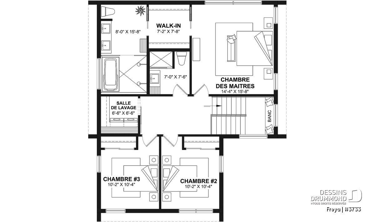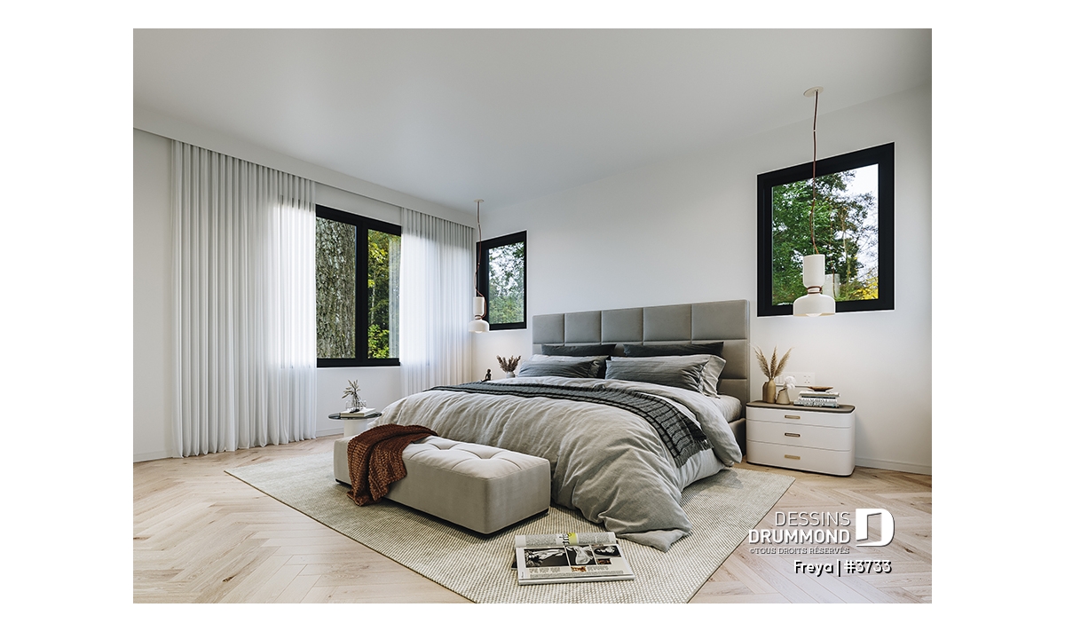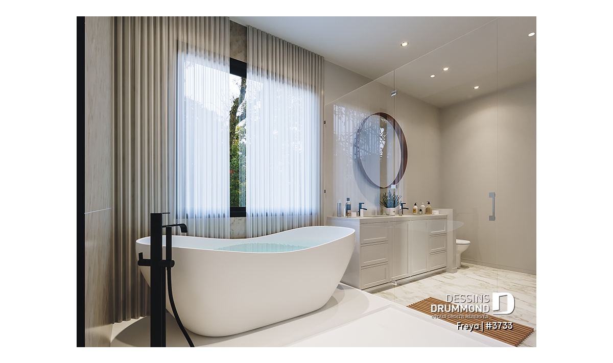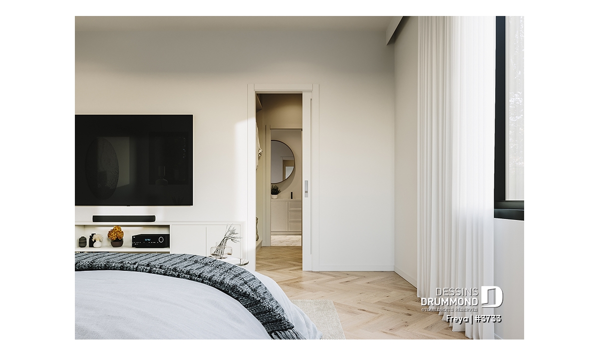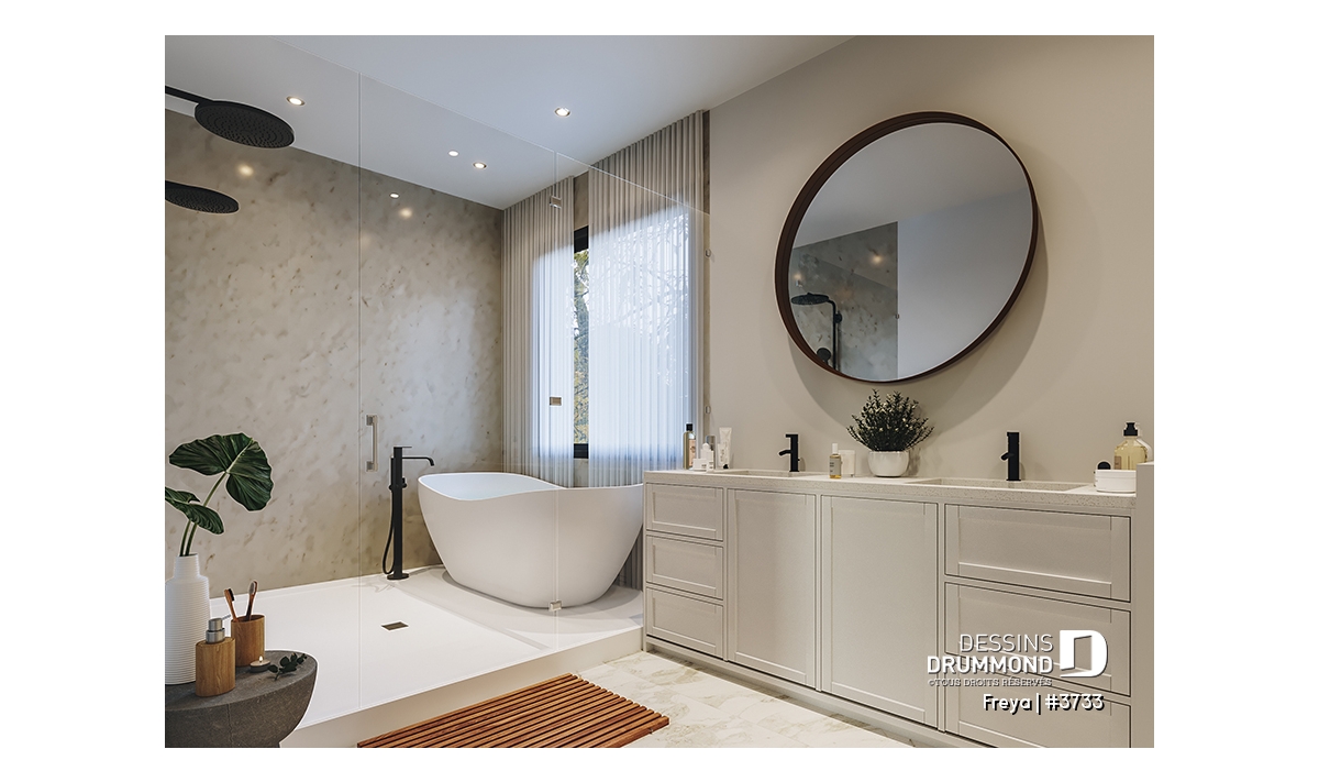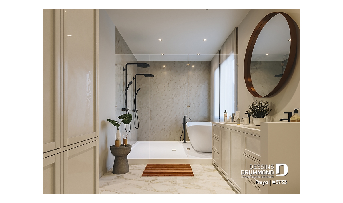 La suite des parents propose un secteur aménagé d'un bain et d'une douche, ainsi qu'un garde-robe de type walk-in.