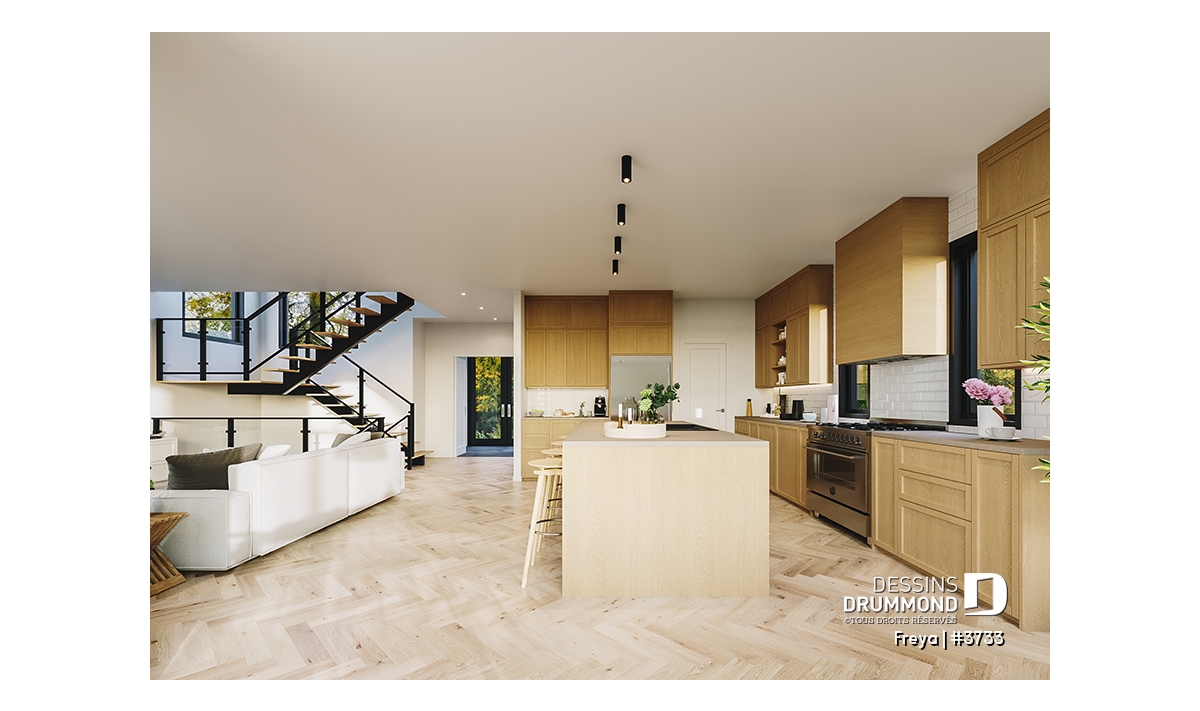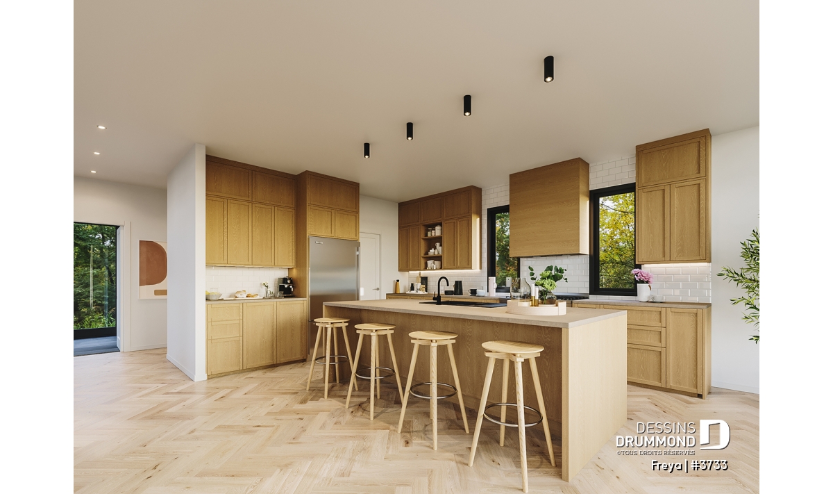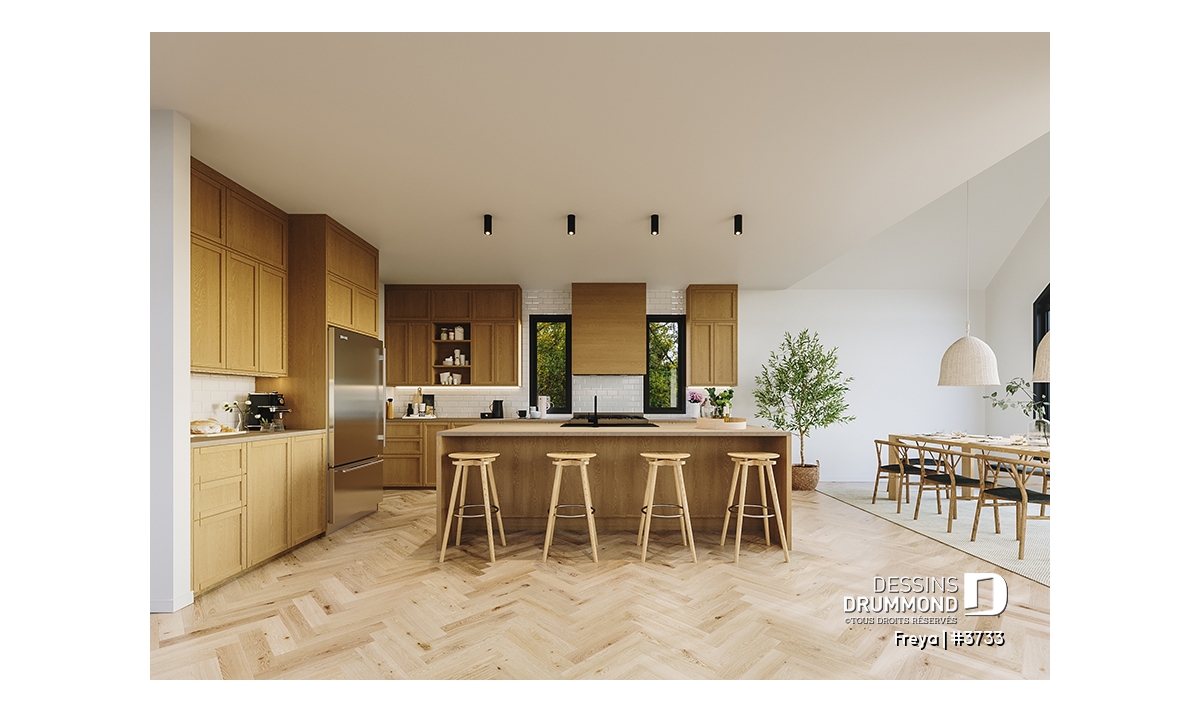 Cuisine avec garde-manger et îlot, et ouverte d'un côté sur la salle à manger et de l'autre, sur la salle de séjour.