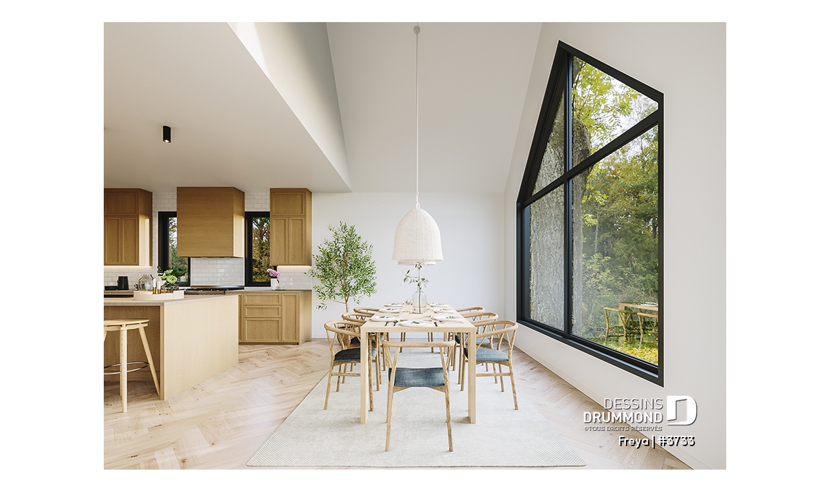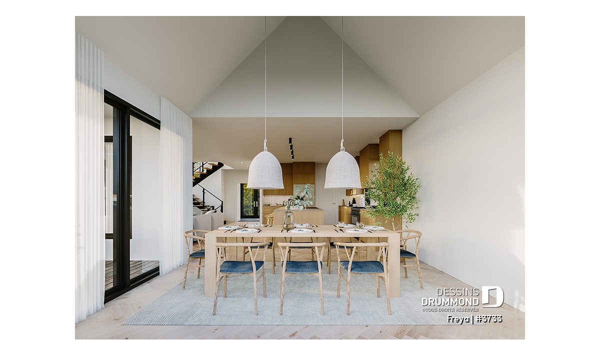 Salle à manger très lumineuse avec plafond cathédrale et accès à la terrasse abritée.