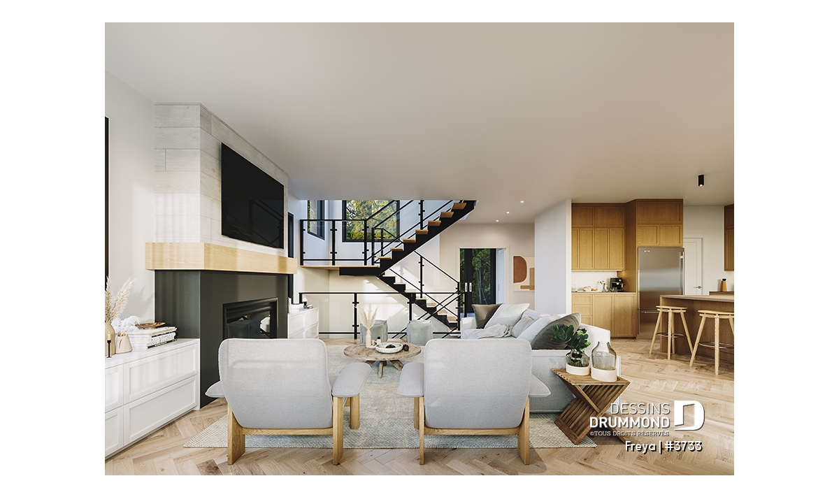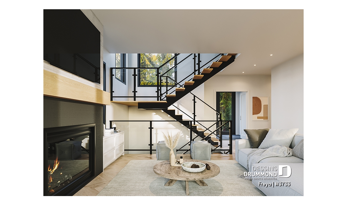 Salle familiale avec foyer central et tablettes aménagées de chaque côté.