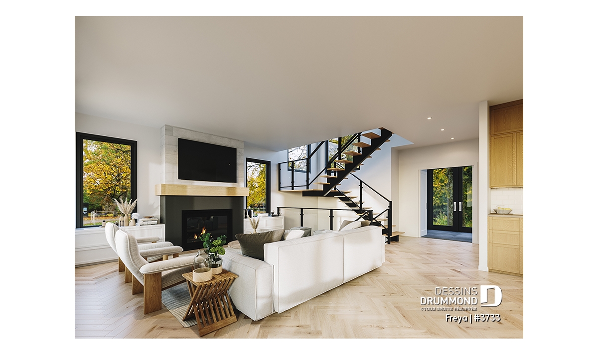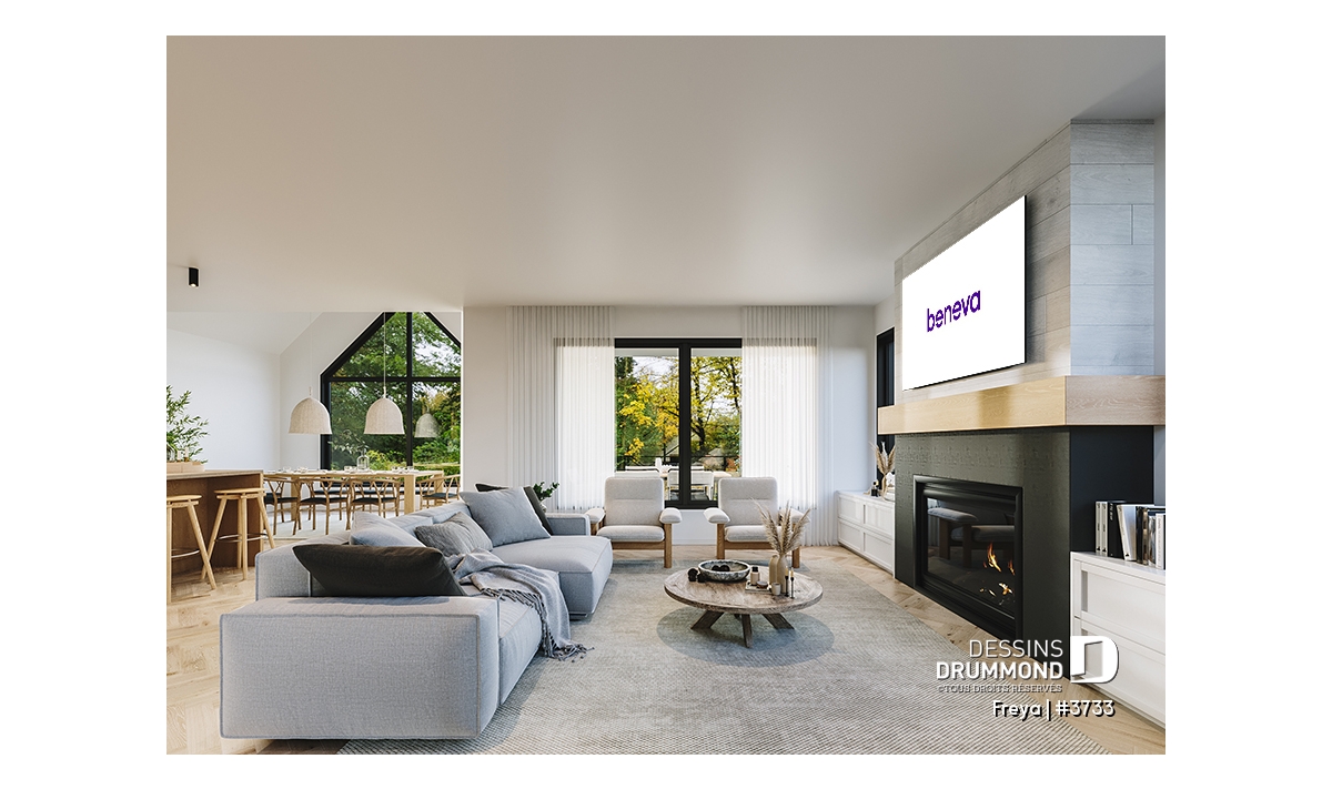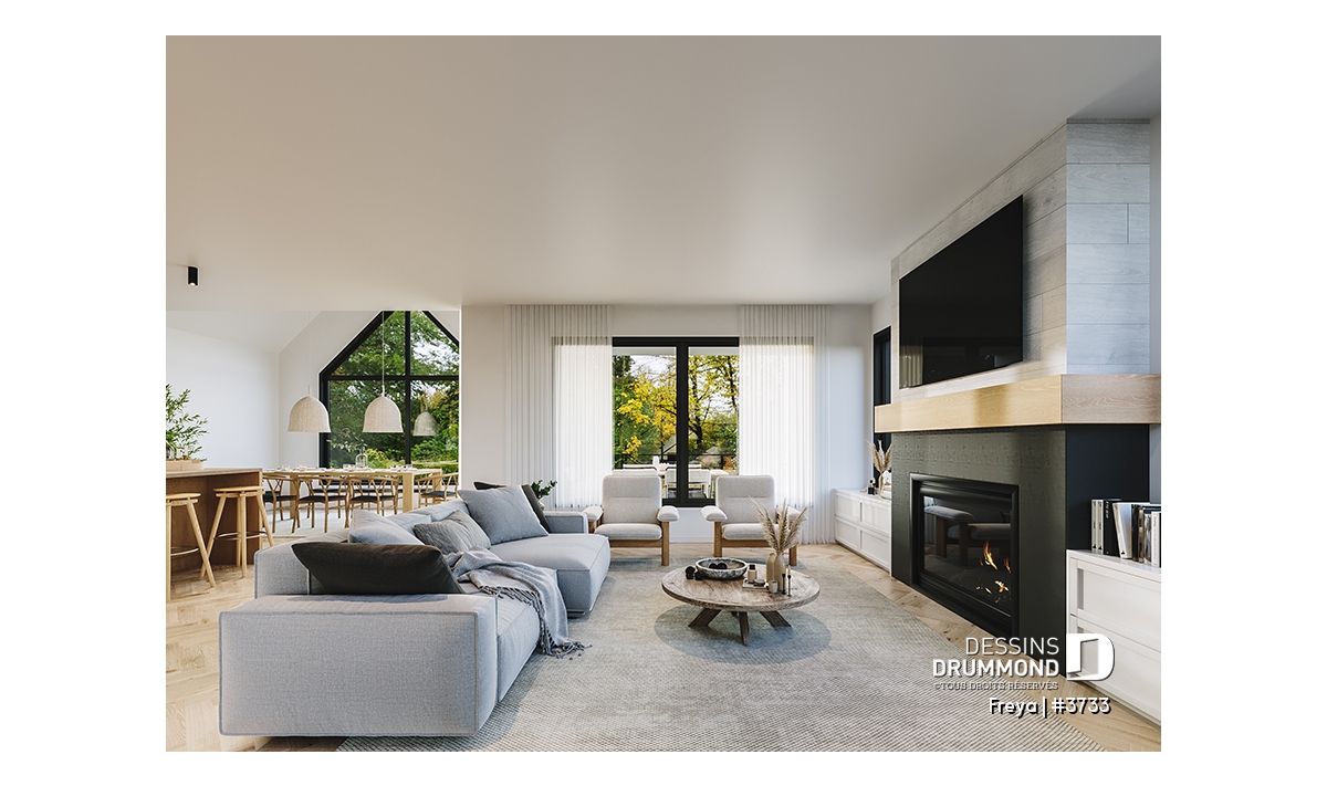 Salon avec foyer et fenêtres donnant sur la terrasse.