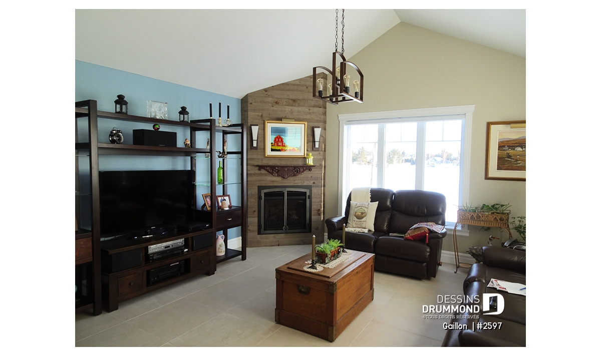 Une large fenêtre munie d’une imposte en demi-lune offre pour sa part plein de lumière à la salle de séjour agrémentée d’un plafond cathédrale.