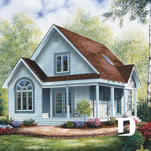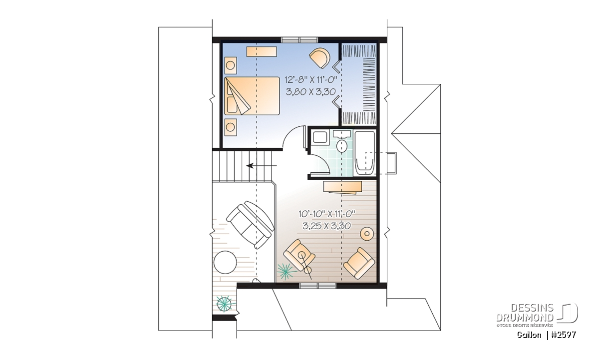 Plan de maison à étage, 2 chambres + loft, champêtre, plafond cathédrale et mezzanine, aire ouverte