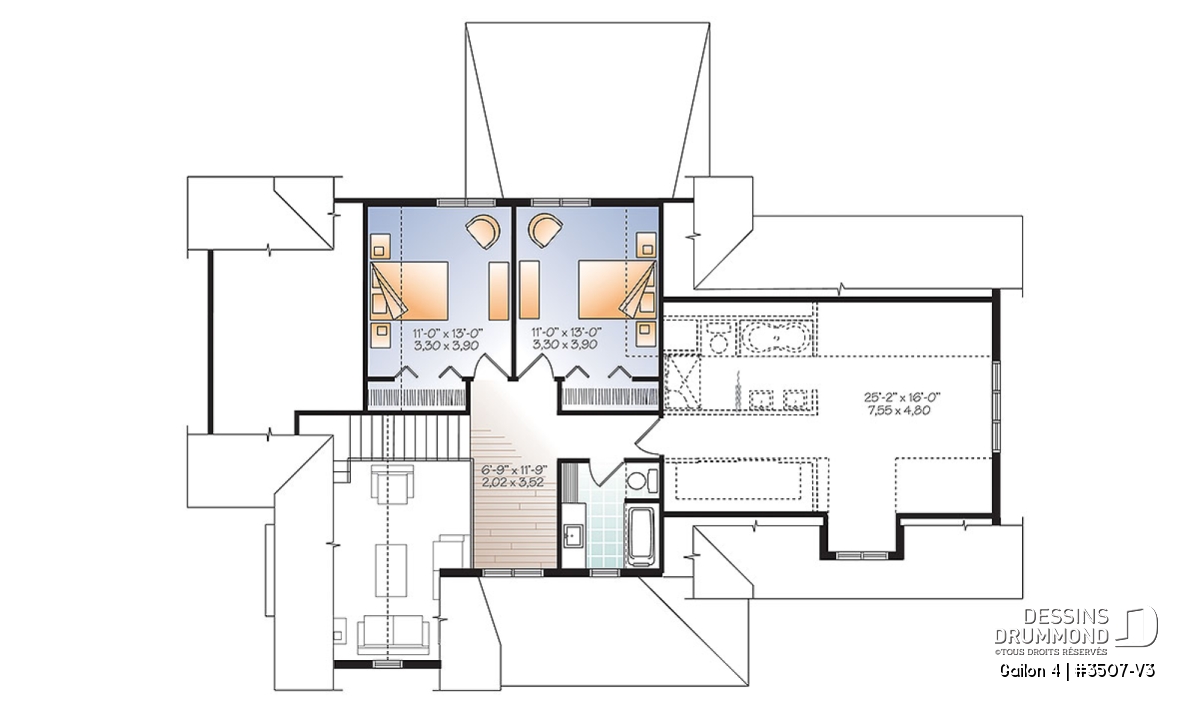 L’étage, pour sa part, n’est pas en reste avec sa mezzanine, ses deux chambres secondaires de bien beau format, sa salle de bain et son vaste espace boni aménageable en salle familiale ou bien, comme signalé ici en pointillé, en suite d’invités que ceux-ci sauront certainement apprécier.