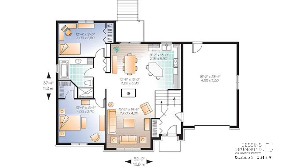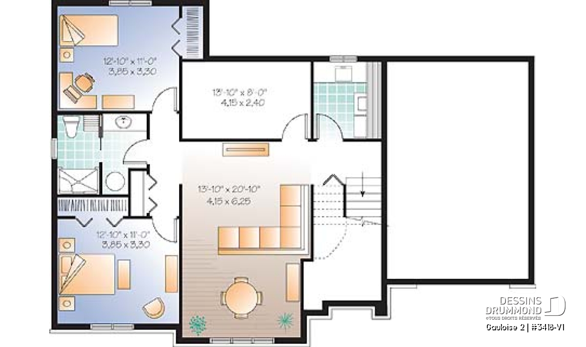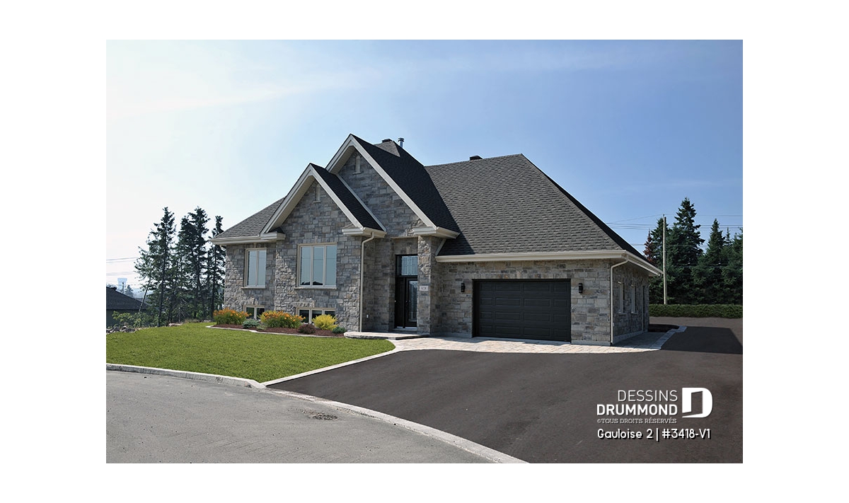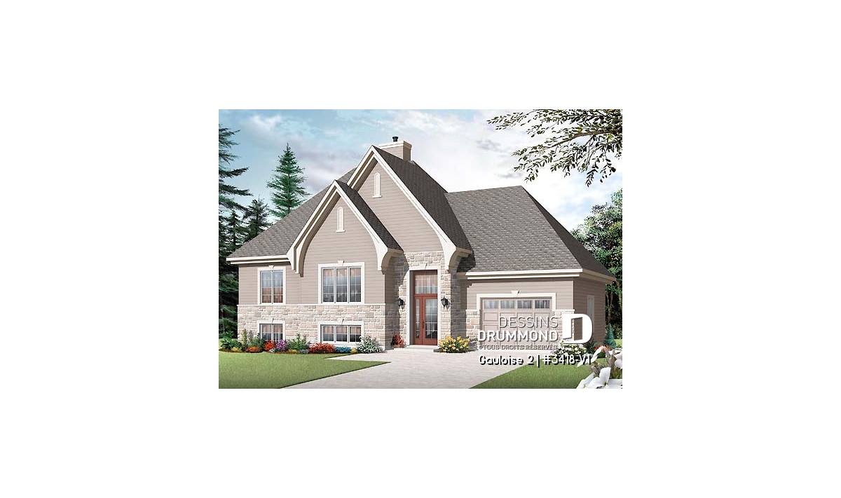 Avec cette demande croissante pour des modèles de maison offrant 4 chambres, Dessins Drummond se fait un plaisir de répondre aux attentes de sa clientèle en proposant des plans comme ce 3418-V1, conçu à partir du très populaire modèle 3418 et suggérant à la fois un aménagement intérieur de 4 chambres et plein d’utilités.