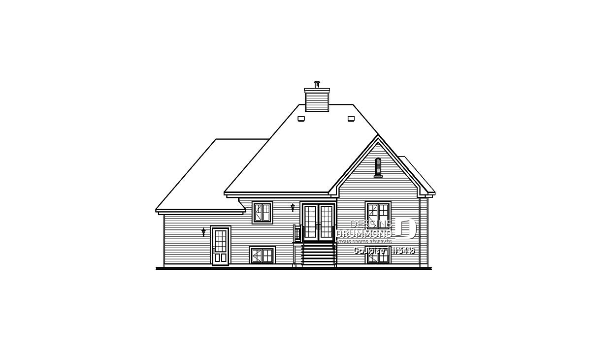 Vue avant - MODÈLE DE BASE - Plain-pied à entrée split, petit budget, plafond cathédrale, foyer central, cuisine avec îlot - Gauloise