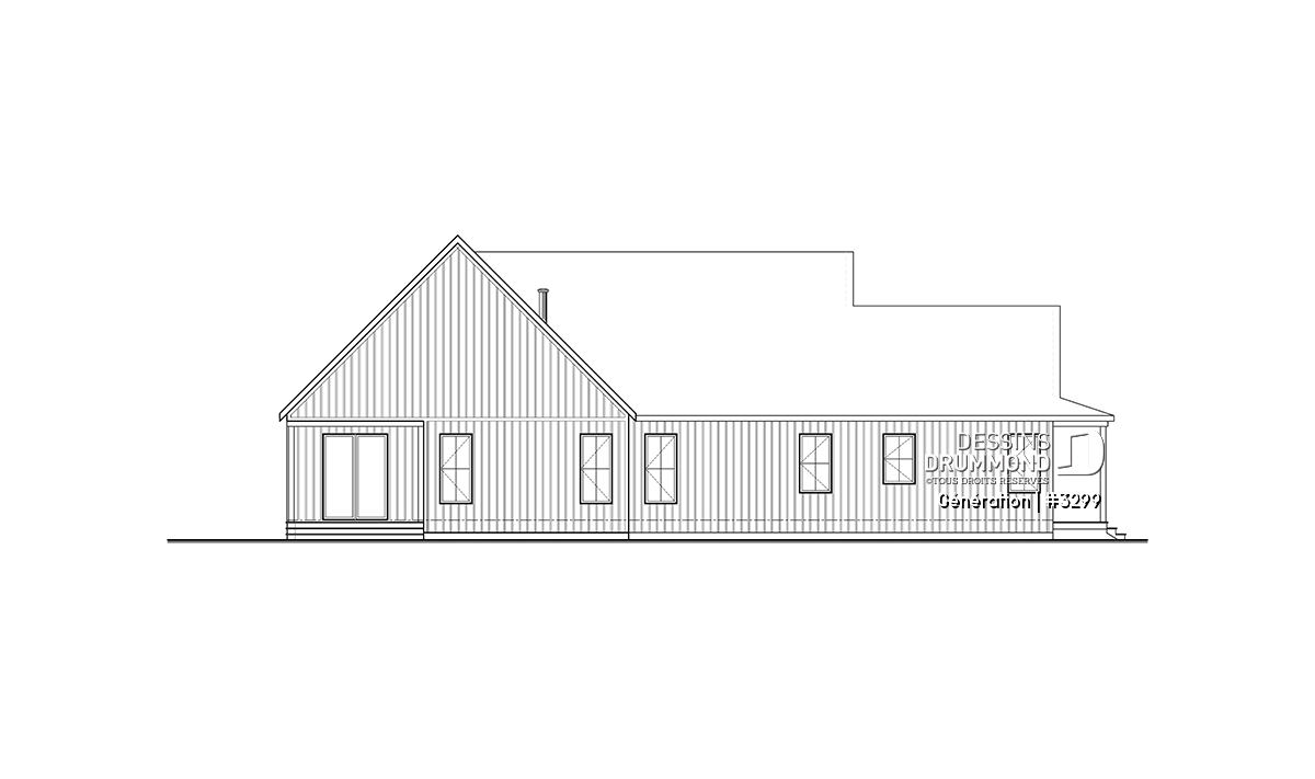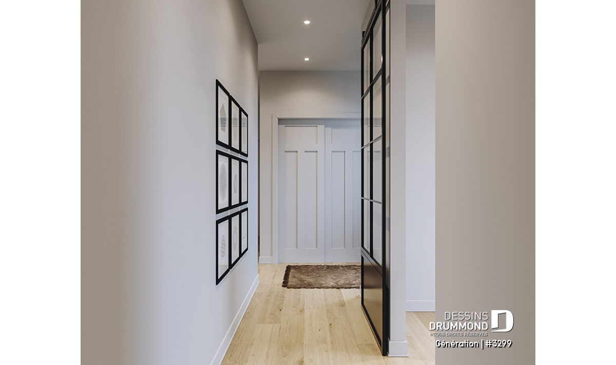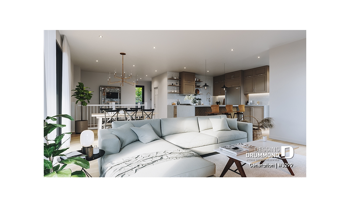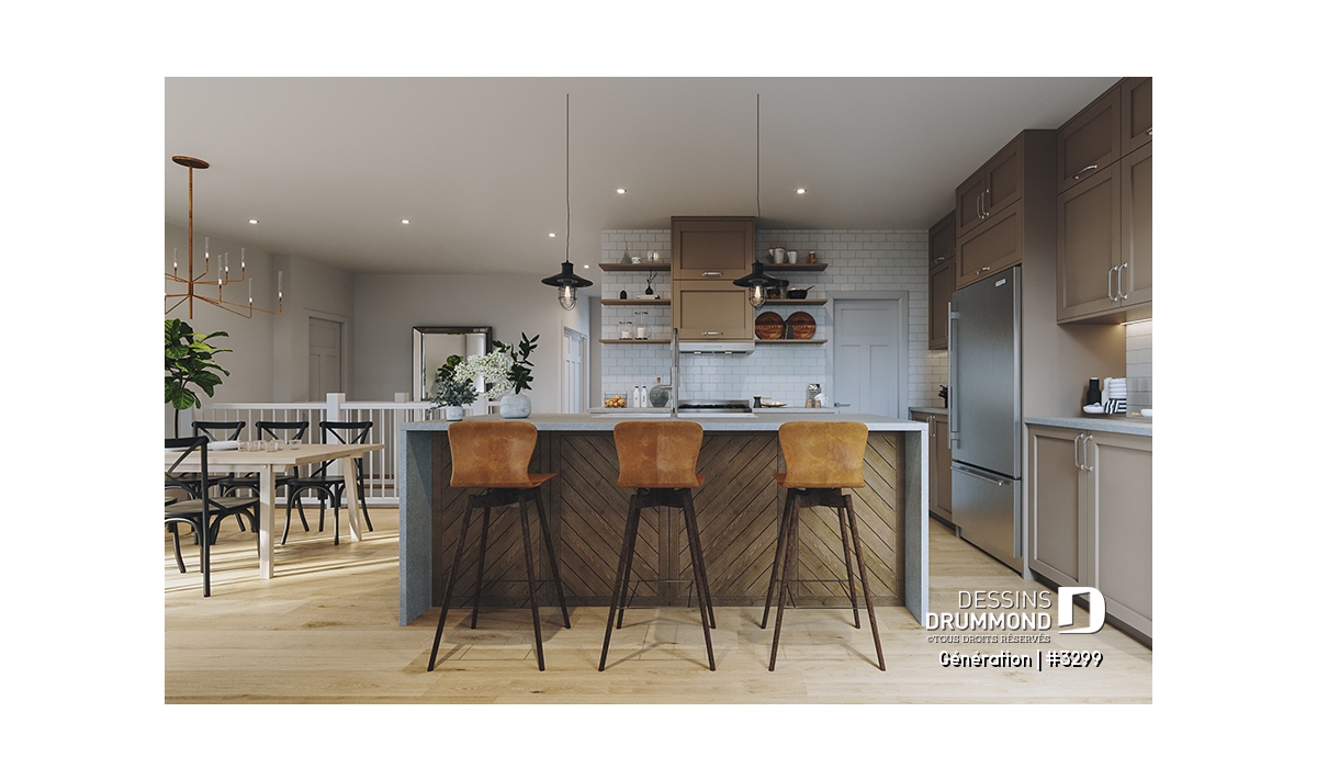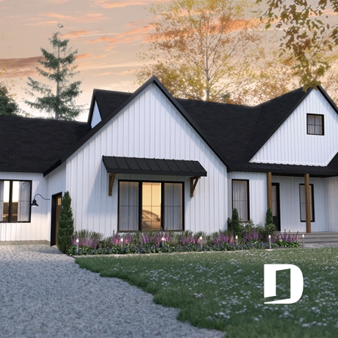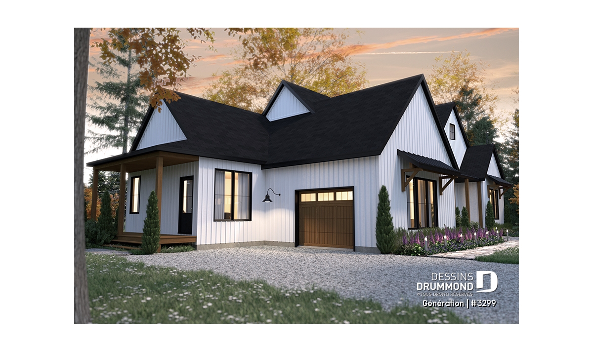 Plan de maison bigénération de style Farmhouse moderne, très tendance, avec plafond à 9' partout.