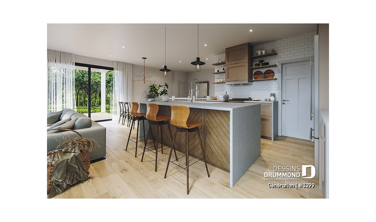 La cuisine est ouverte au salon et à la salle à manger, et adjacente à un grand garde-manger. Le coin prévu pour l'accès au logement #2 pourrait aussi recevoir une banquette ou simplement une table de travail pour ceux qui le souhaitent.