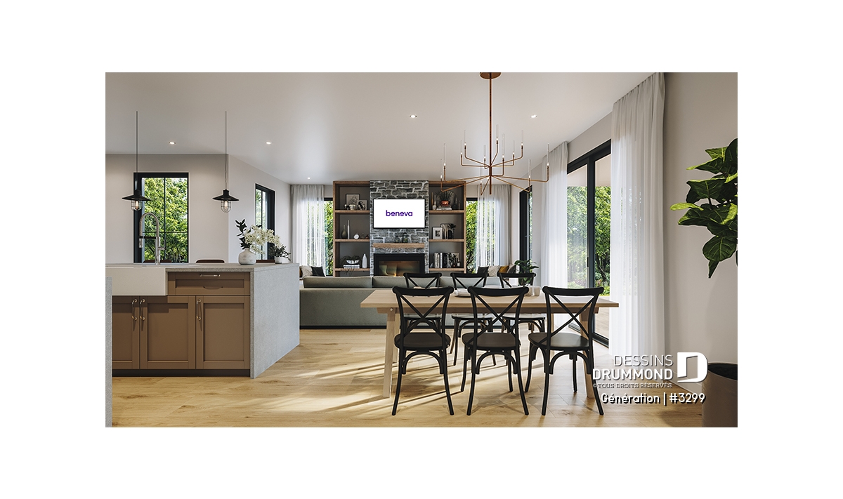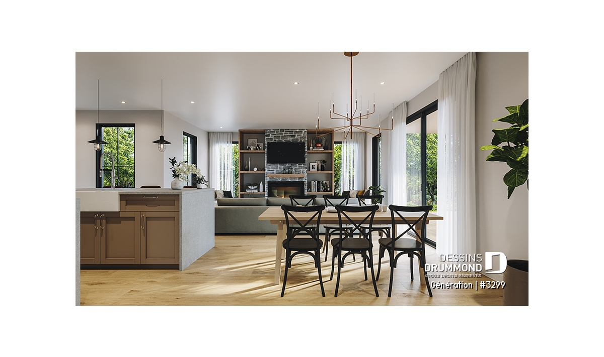 Le salon possède un foyer et de l'espace pour installer des tablettes de chaque côté. Plusieurs fenêtres y sont aménagés amenant ainsi une belle lumière naturelle à cet espace. De plus, le salon offre aussi un accès à la terrasse privée et abritée via des portes-patio ou portes jardin, à la convenance des propriétaires.