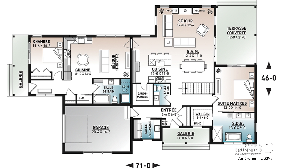 Aire ouverte, Salle de lavage au rez-de-chaussée, Ilôt, Aire ouverte, Plafond à plus de 8', Salle de lavage au rez-de-chaussée, Plafond à plus de 8', Garde-manger, Suite des maîtres au rdc, Walk-in ch. maîtres, Terrasse abritée, Terrasse abritée, Bain et douche séparés, Lavabo double, Foyer, Ilôt, Banquette