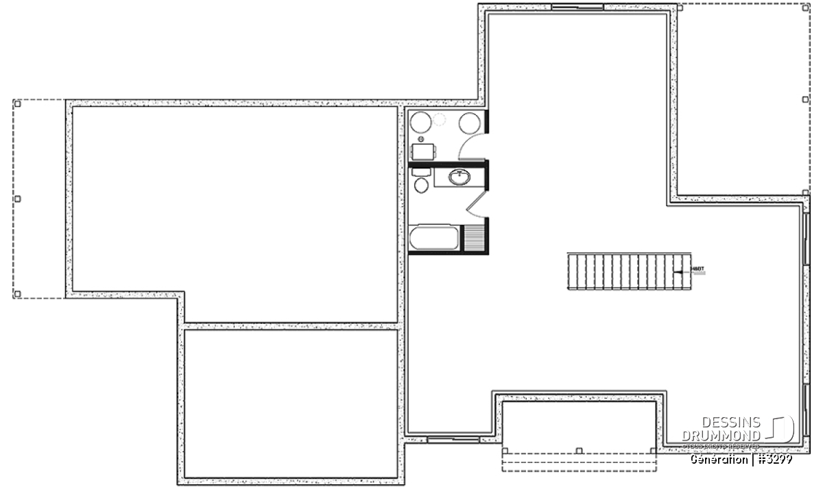 Le plan de maison bi-génération GÉNÉRATION (#3299) a 1306 pi.ca au logement principal (à droite) et 680 pi.ca. au logement secondaire (à gauche). Les espaces extérieurs des deux logements sont à l'opposé l'un de l'autre permettant ainsi aux occupants de vivre une intimité au quotidien.