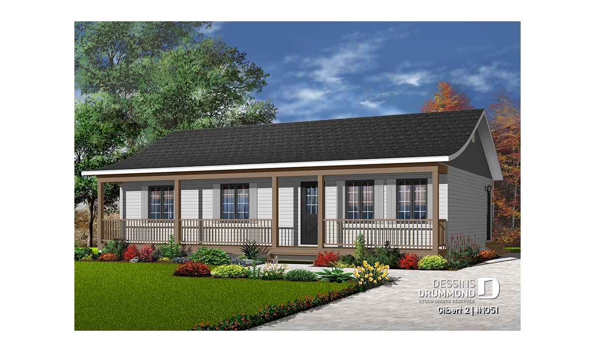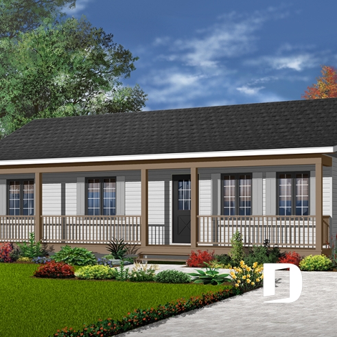 Plan de plain-pied économique de 3 chambres avec grande salle de séjour, et coin buanderie au rez-de-chaussée