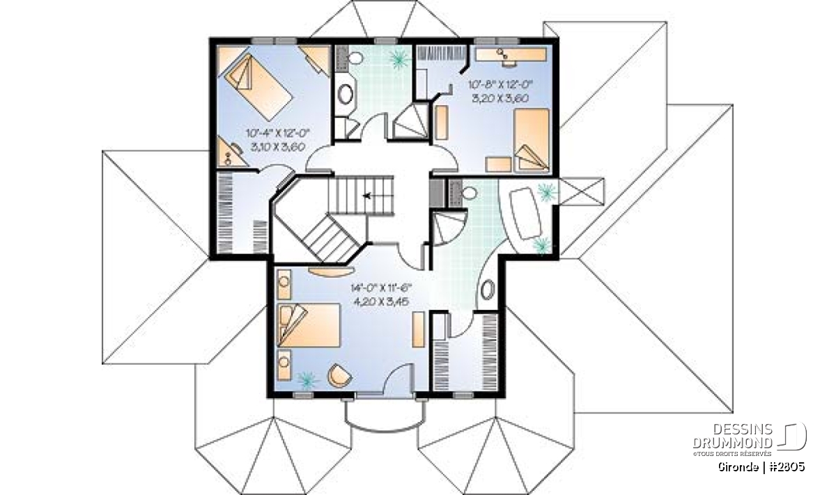 Plan de maison classique, 3+ chambres, plafond 9' au rdc, balcon à la suite des maîtres, garage