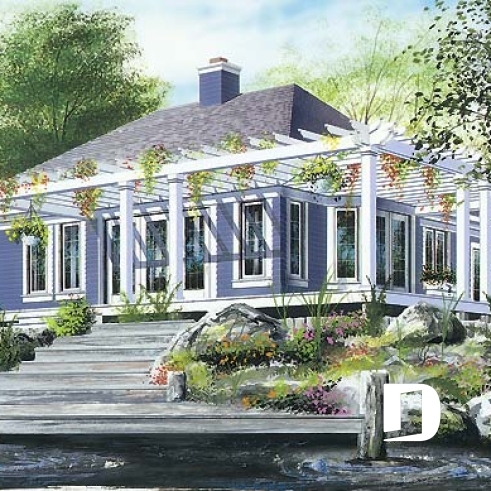 Plan de bungalow lumineux, foyer central, cuisine avec îlot, pergola