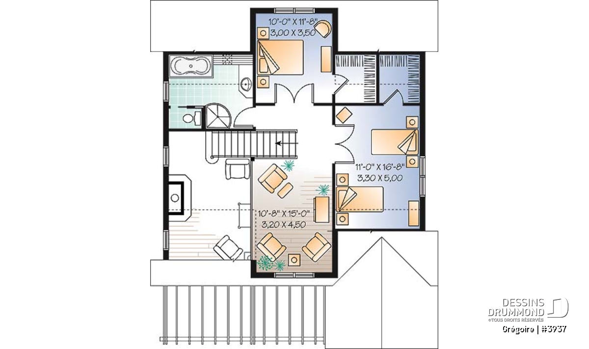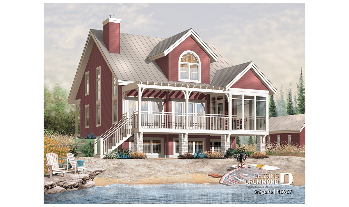 On ne peut passer sous silence cette superbe galerie arrière agrémentée d’une pergola, cet abri-moustiquaire combien apprécié en milieu panoramique et le garage double, avec rangement à l’étage, vendu séparément et que vous êtes en mesure de voir sur notre site dessinsdrummond.com sous le numéro 2987 dans les plans de garages.