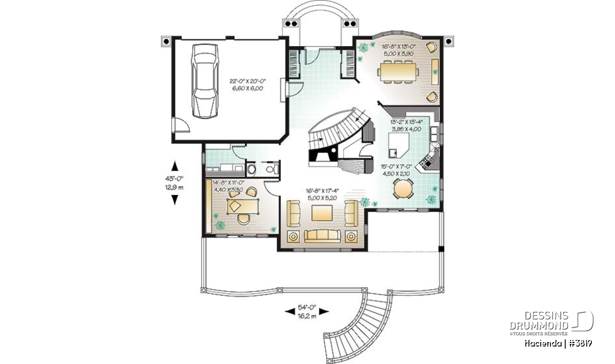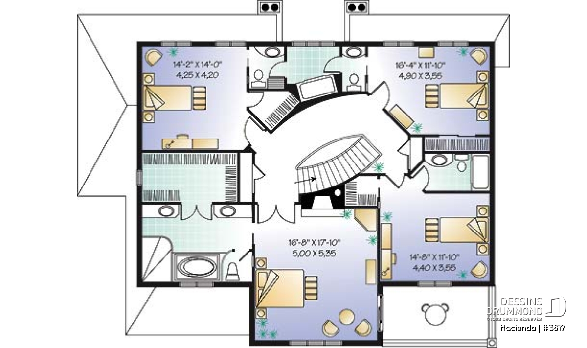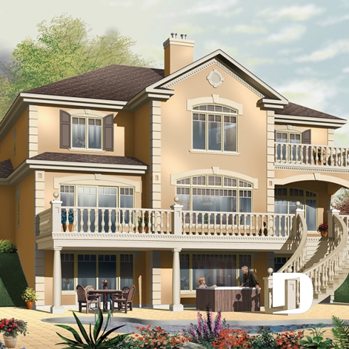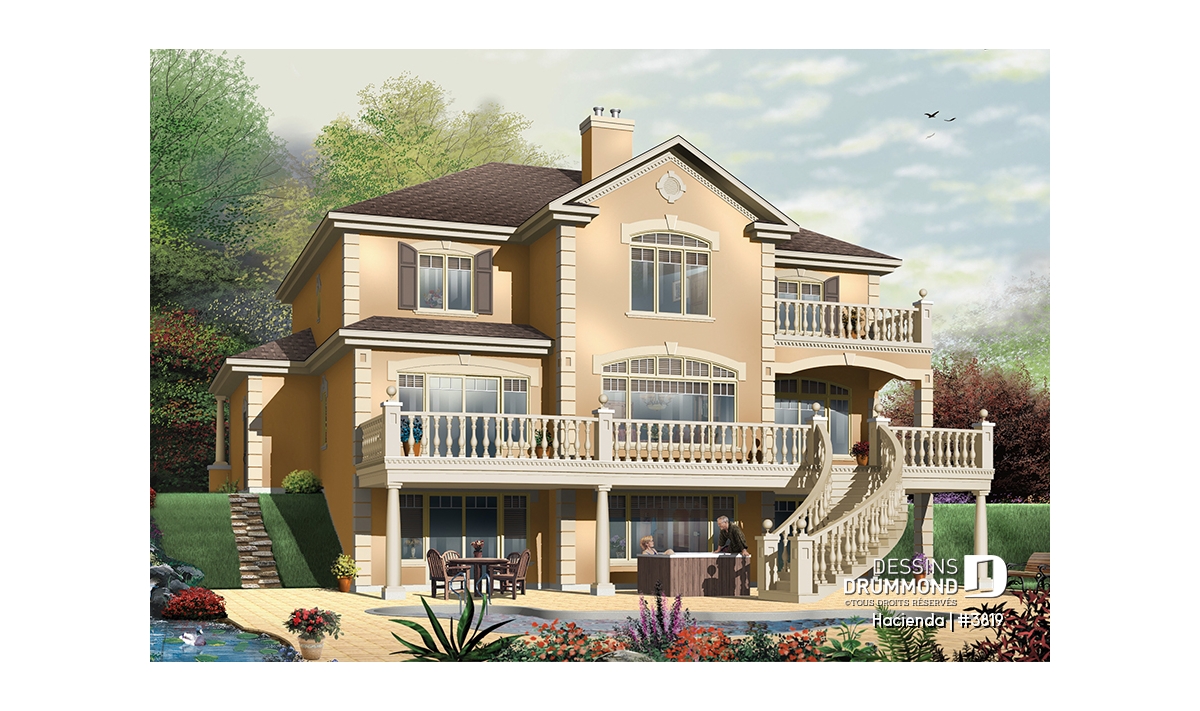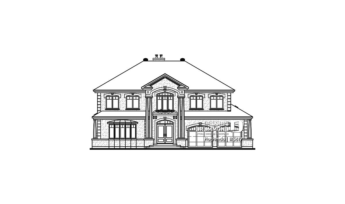 Conçu à partir du modèle no.2819 de Dessins Drummond et afin de lui donner plus d’envergure, ce modèle aux allures exotiques suggère un extérieur très distinctif avec son garage double, ses terrasses arrière remarquables, sa volumétrie et sa mouluration peu communes.
