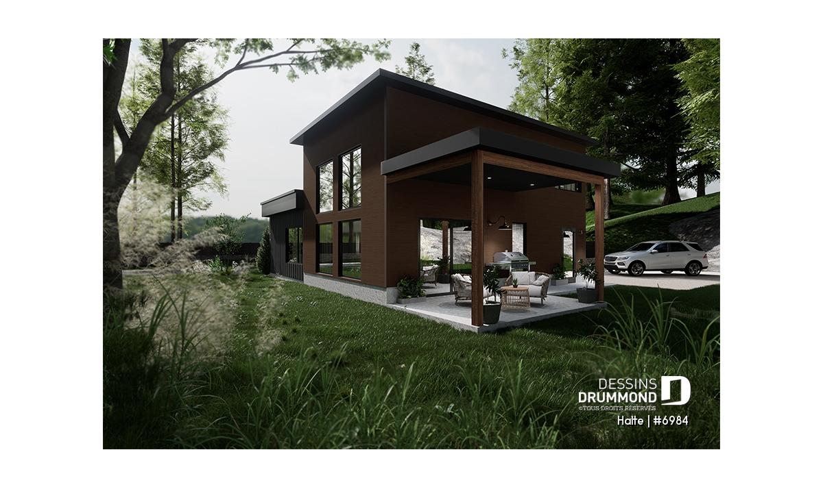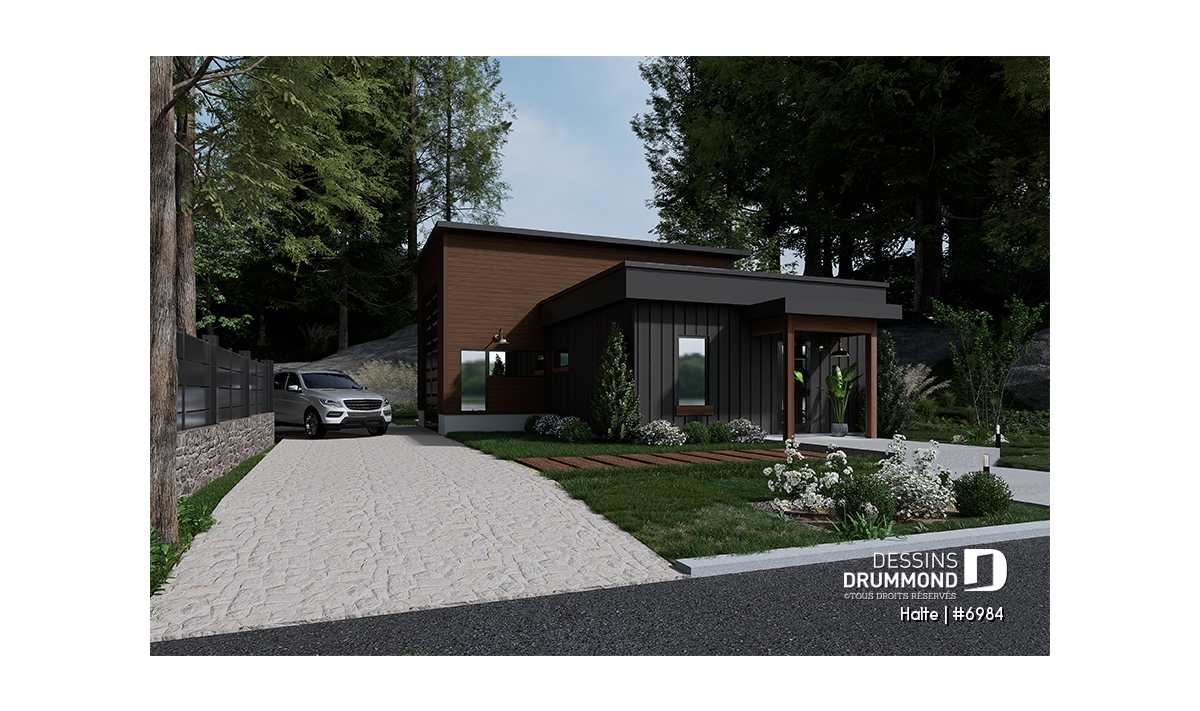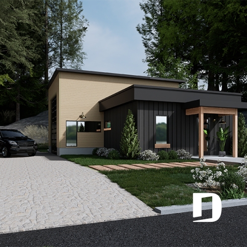 Petite maison moderne avec garage de format idéal pour petit motorisé et options de 2 chambres avec ou sans garage simple. Les 3 options incluent une fondation de type dalle flottante. D'autres types de fondation sont disponibles, veuillez nous contacter.