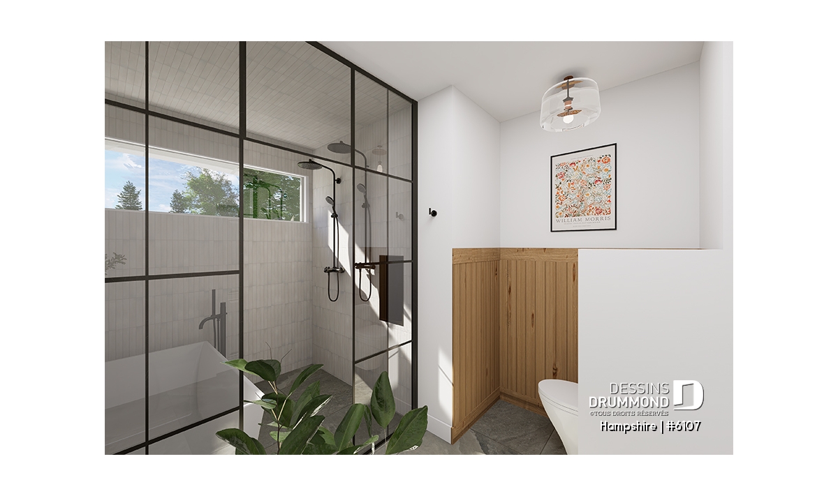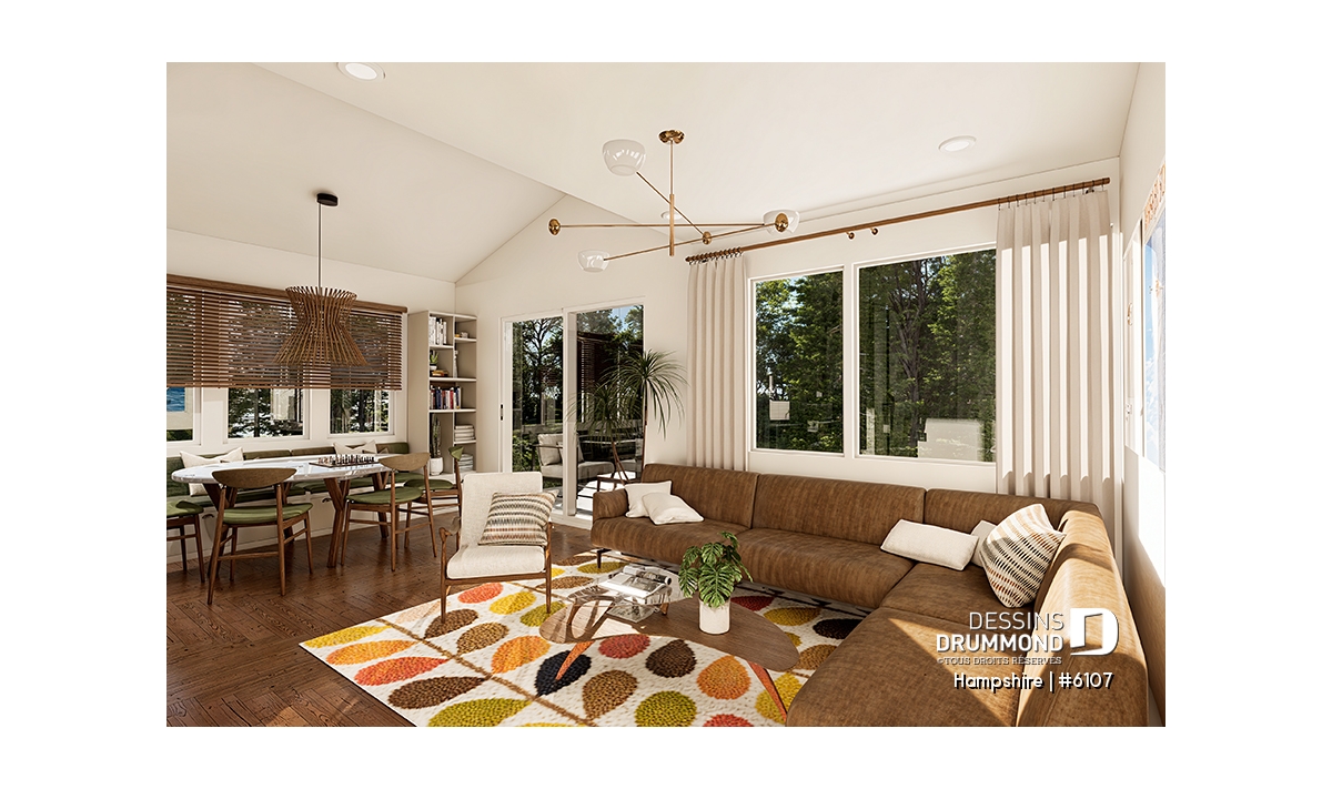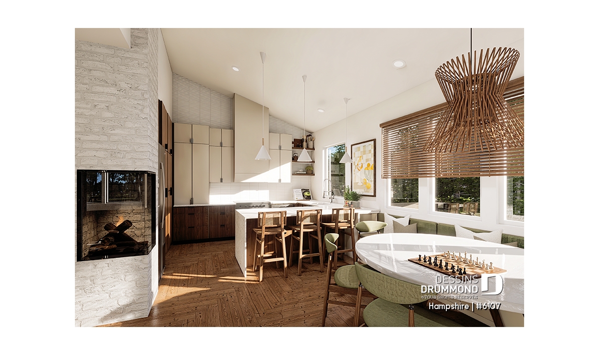 Plafond en pente, Banquette, Bain dans la douche, Plafond à plus de 8', Tablettes, Meuble(s) encastré(s), Comptoir-lunch, Aire ouverte, Foyer, Bain dans la douche