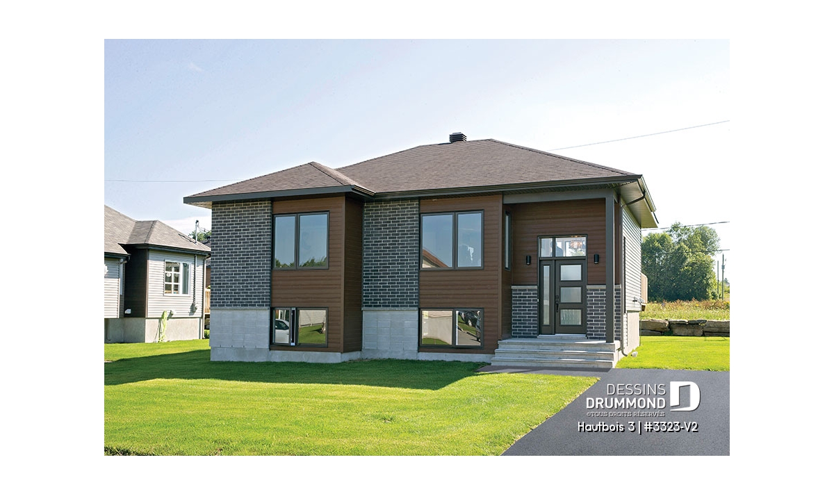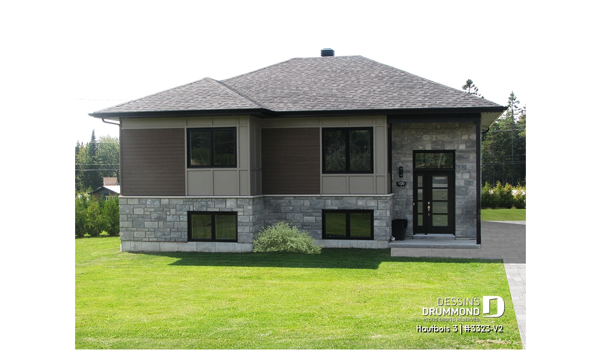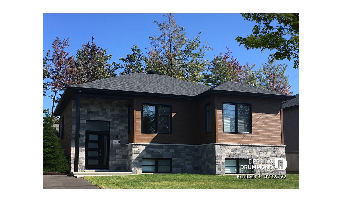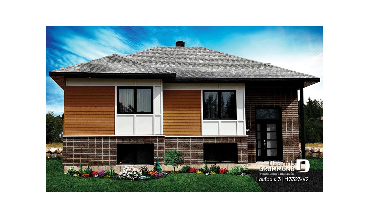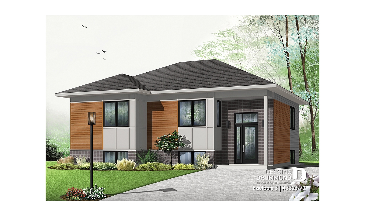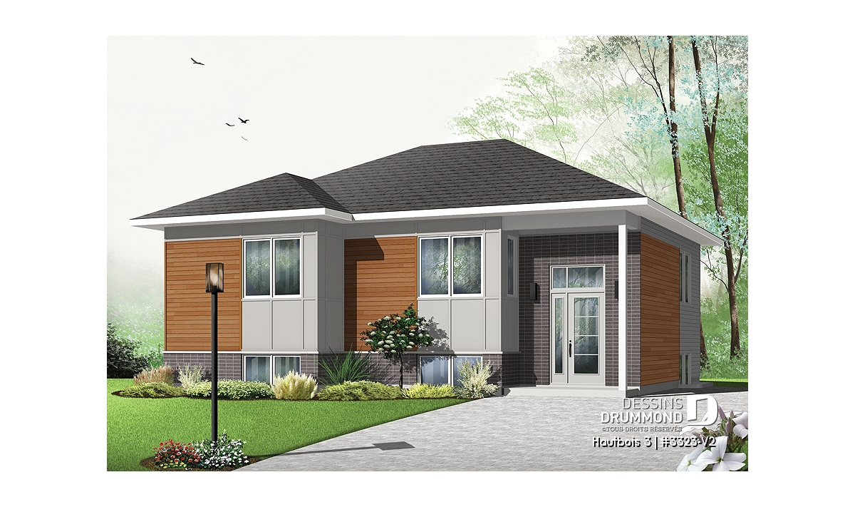 Plan de bungalow de type split-level contemporain, 2 chambres, aire ouverte, sous-sol aménageable,