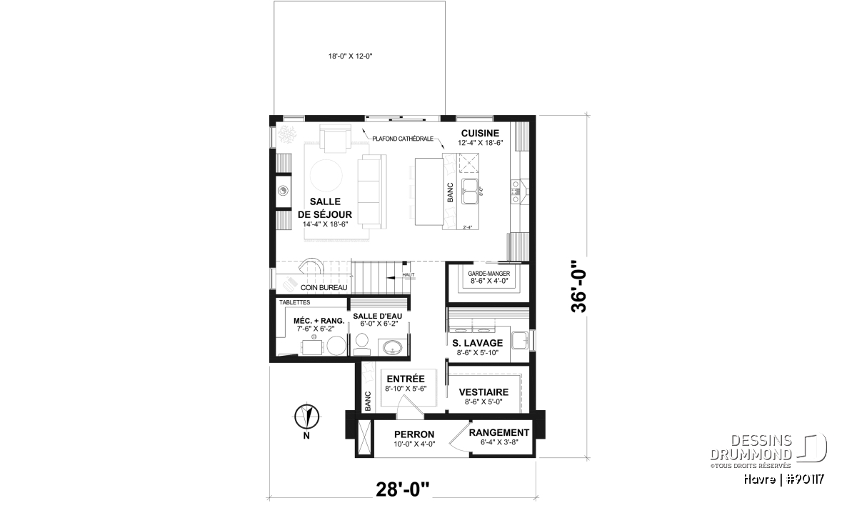 Salon ouvert sur la cuisine, et avec plafond à plus de 18' de hauteur.