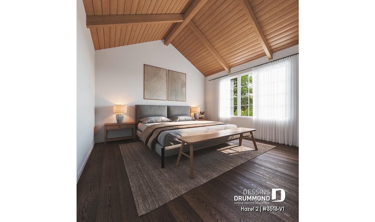 Suite des parents à l’étage, avec plafond cathédral, salle de douche privée et walk-in spacieux.