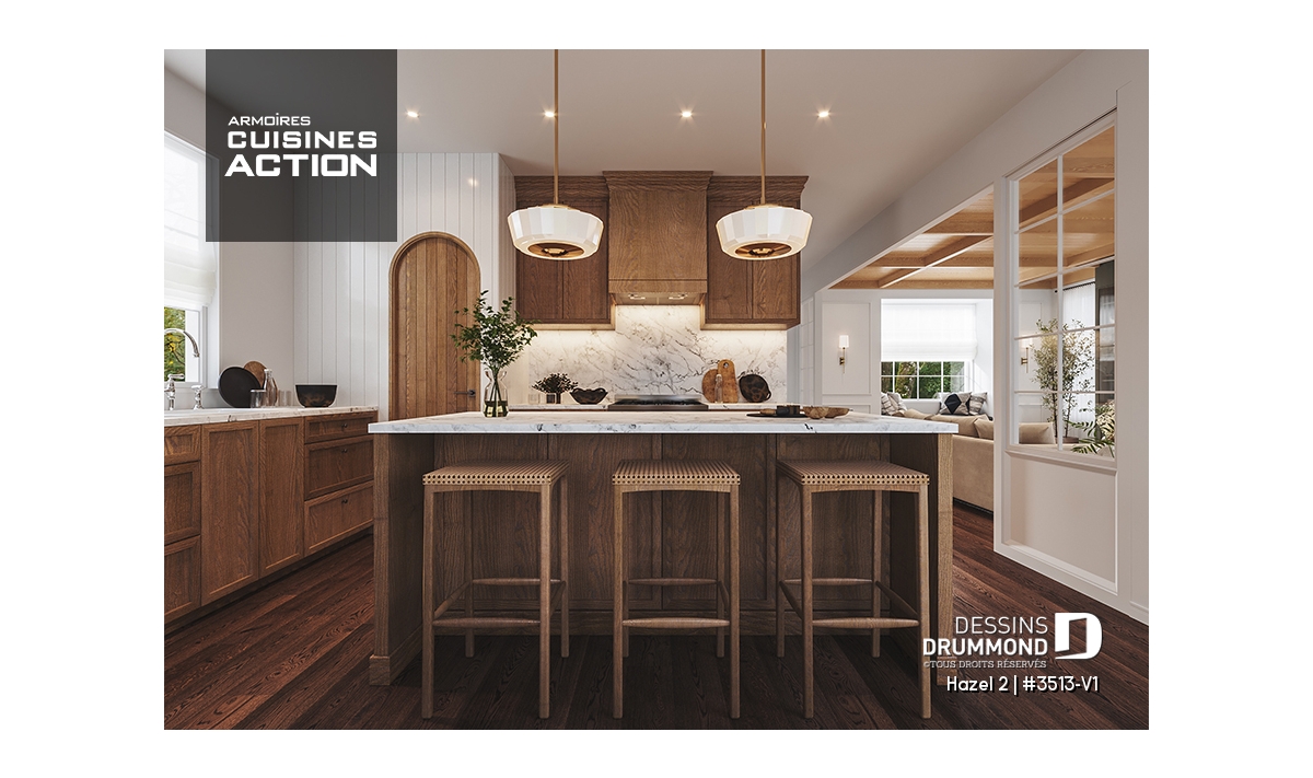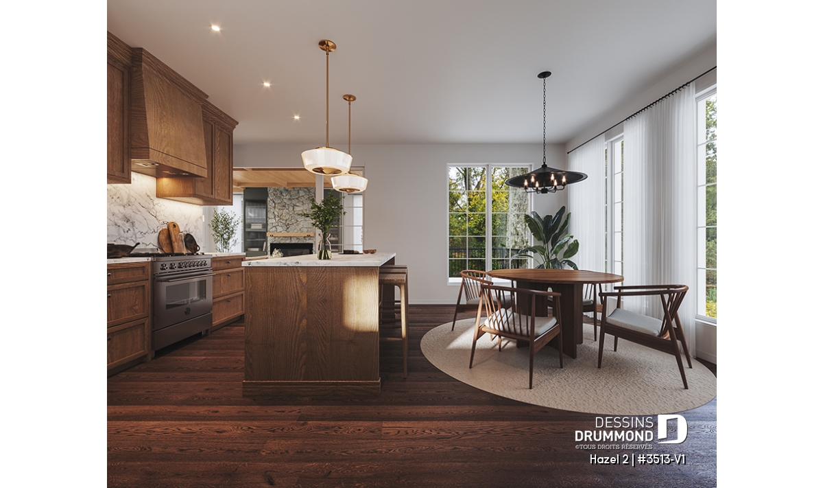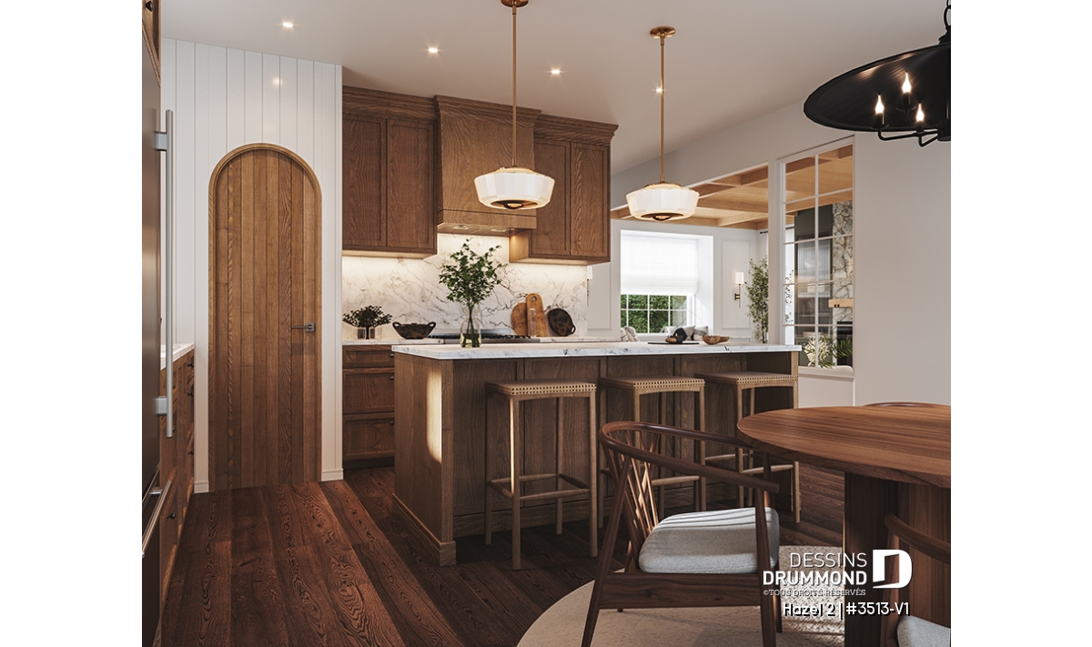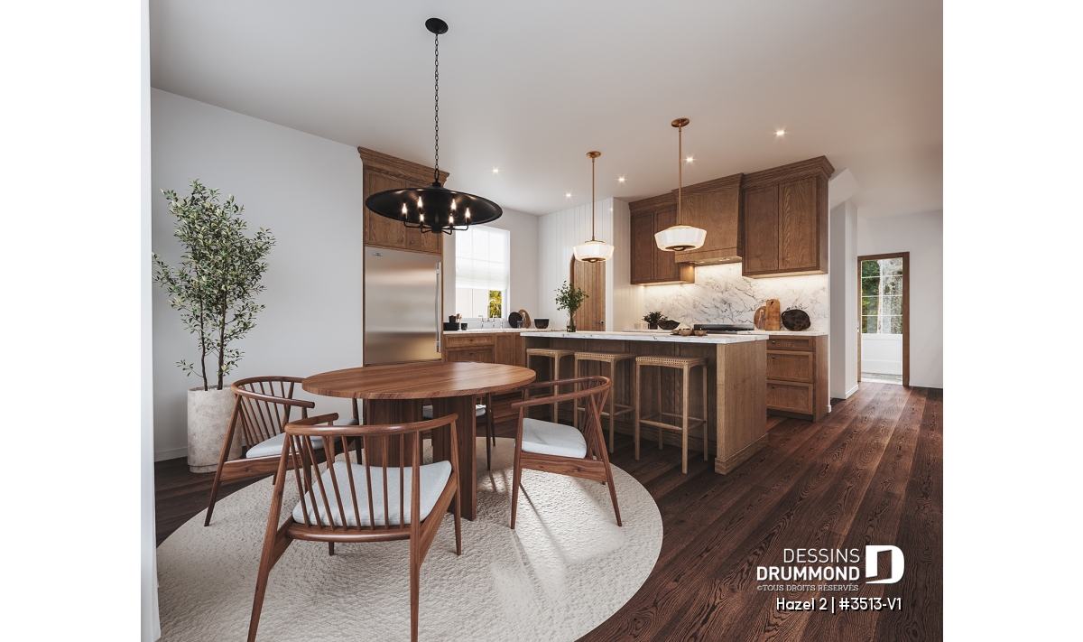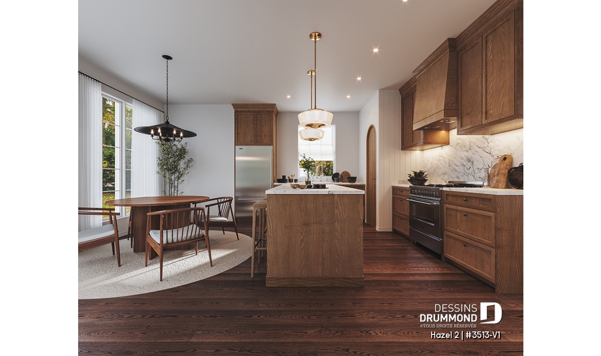 La cuisine fonctionnelle et conviviale, dotée d’un îlot central et d’un pratique garde-manger, est ouverte sur la salle à manger lumineuse, idéale pour partager des repas en famille ou recevoir des invités. Cet espace de vie ouvert combine confort moderne et charme classique, mettant en valeur la convivialité recherchée dans un tel plan.