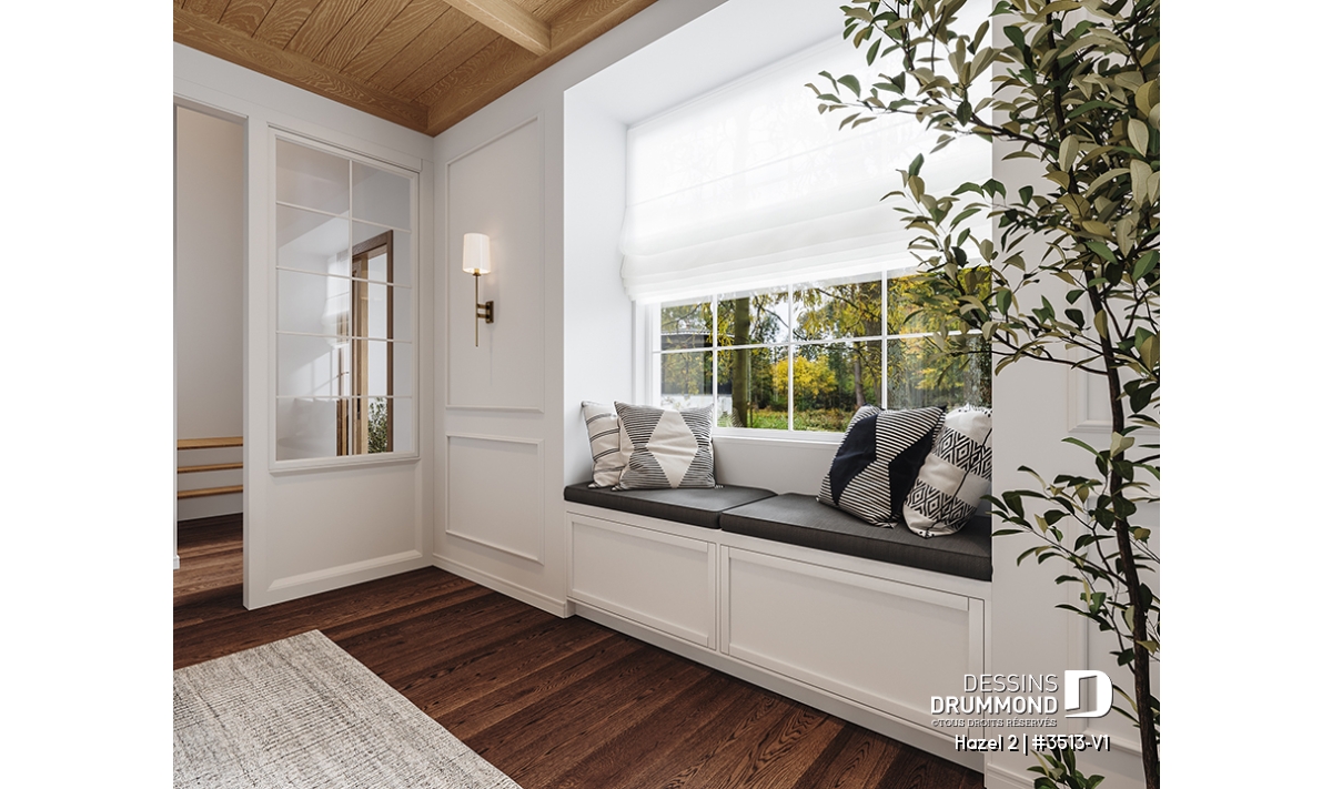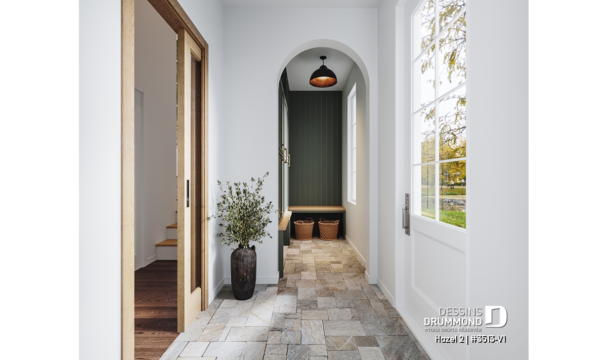 Entrée élégante avec plafond en arche menant vers un pratique garde-robe et un banc intégré.