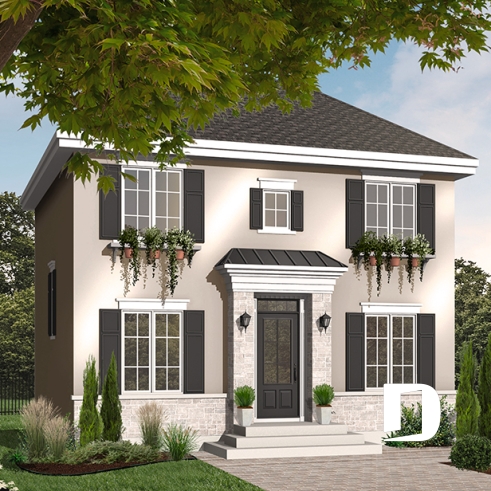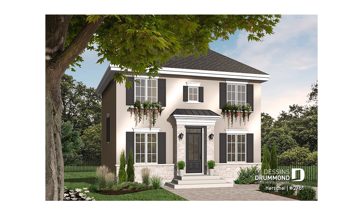 Porte principale des mieux enveloppées, agrégat aux murs et touche de brique/pierre en façade, persiennes à plusieurs fenêtres, boîtes à fleurs originales et débordantes comme il fut tant remarqué en France après la deuxième guerre mondiale, sont là tous des éléments conférant à ce modèle une touche des plus européennes.