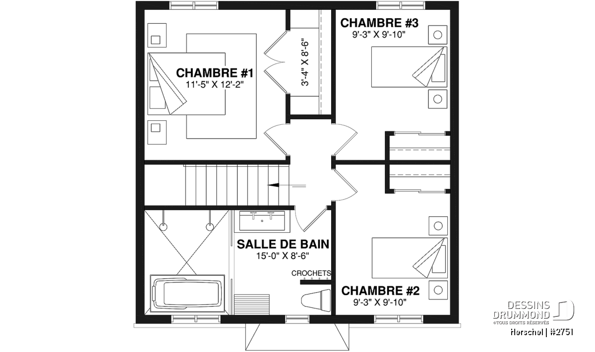 À l’étage, on retrouve trois belles chambres ayant chacune une garde-robe intéressante et plus particulièrement une salle de bain très confortable pour un modèle de ce gabarit. Celle-ci propose un secteur bain/douche intégré et une toilette bien discrète, comme fortement suggéré en aménagement idéal de salle de bain.