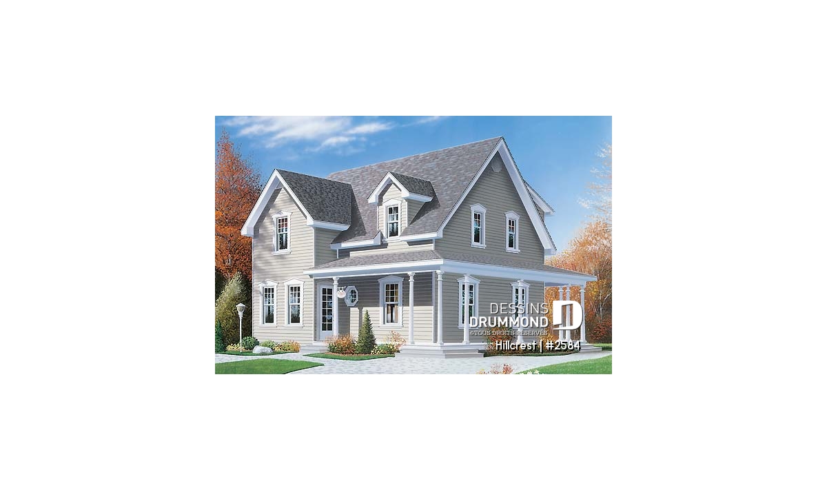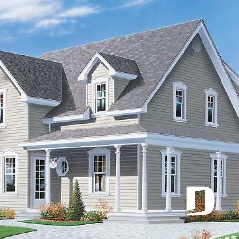 Plan de maison 3 chambres, style champêtre canadien, îlot, buanderie au r-d-c, grande chambre parents
