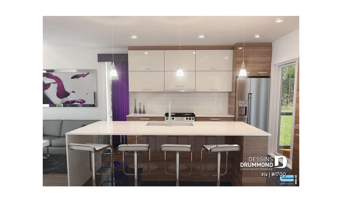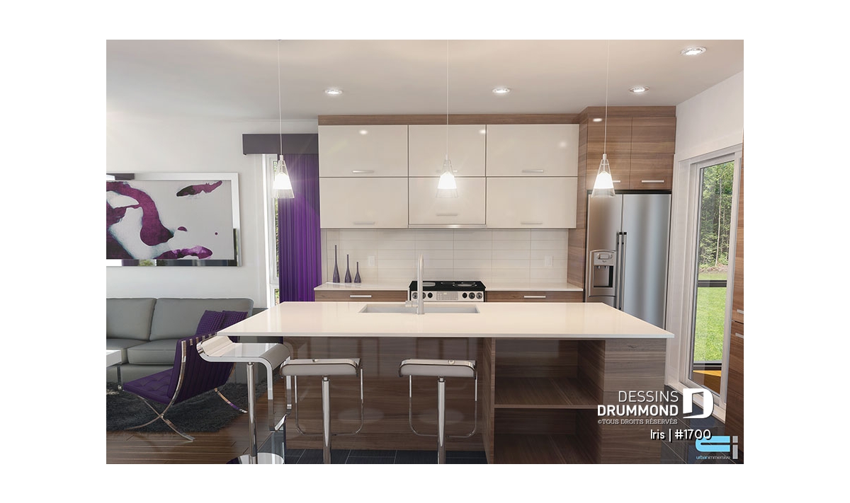 La salle familiale est de bon format et permet la mise en place d'un meuble télé conventionnel. En plus d'un fauteuil 3 places, elle peut se partager 2 chaises individuelles qui serviront aussi de chaises supplémentaires en cas de visite ou d'un besoin additionnel dans la salle à manger. L'îlot de la cuisine reçoit l'évier, un cellier et un coin table, qui pourrait être choisi avec l'option d'être agrandi. Sous l'escalier menant à l'étage, on retrouve une garde-robe de rangement et aussi une buanderie / salle d'eau, avec laveuse-sécheuse superposées.