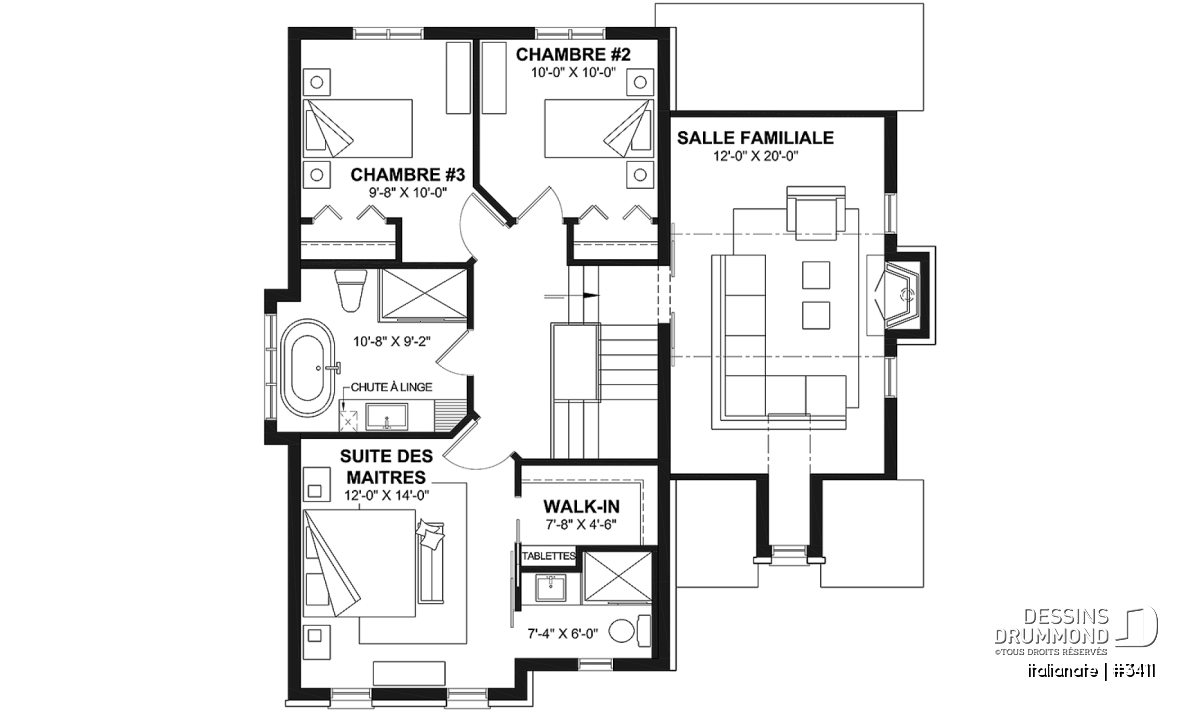À l’étage, la suite des parents se distingue par son walk-in et sa salle de douche privée, tandis que les deux chambres secondaires se partagent une grande salle de bain familiale.