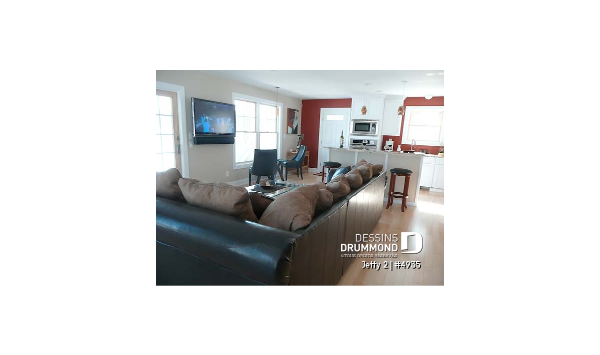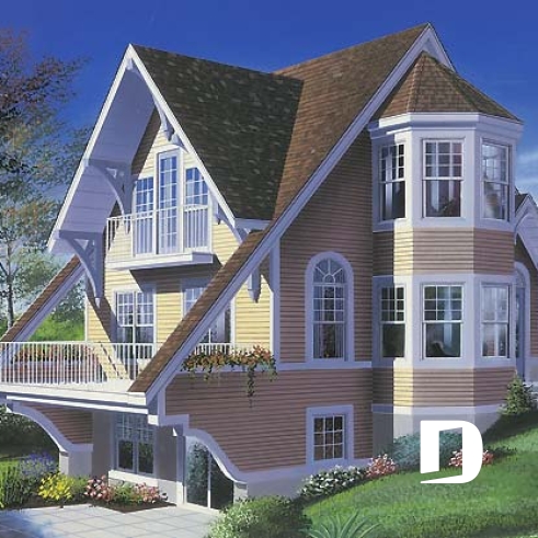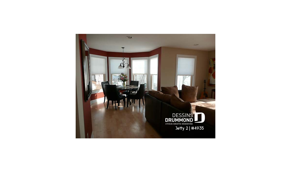 À l’intérieur, cette originalité se poursuit avec l’aménagement, au rez-de-chaussée, d’un vestibule de grand format, d’un secteur activités entièrement ouvert et agrémenté d’une fenestration abondante, d’un espace bain tourbillon dans la tourelle et d’une cuisine avec îlot-lunch central, un « must » dans ce genre d’habitation. À l’étage, ça se poursuit avec deux propositions dont une première suggérant deux chambres avec une salle de bain complète aménagée dans la partie tourelle et, une seconde, tout à fait exceptionnelle et suggérant une unique chambre des maîtres avec salle de bain éclatée et baignoire dans la tourelle. À noter ici que les deux propositions sont incluses au plan et que, pour chacune d’elles, des parties en mezzanine sont suggérées aux chambres de l’étage afin d’occuper ces espaces à plafonds en pente qui ne sont pas vraiment aménageables et ce, pour encore plus d’originalité.