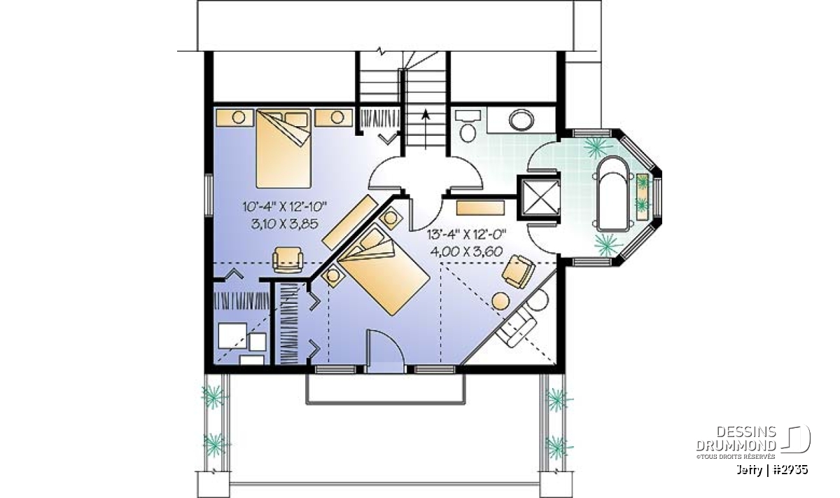 À l’intérieur, cette originalité se poursuit avec l’aménagement, au rez-de-chaussée, d’un vestibule de grand format, d’un secteur activités entièrement ouvert et agrémenté d’une fenestration abondante, d’un espace bain tourbillon dans la tourelle et d’une cuisine avec îlot-lunch central, un « must » dans ce genre d’habitation. À l’étage, ça se poursuit avec deux propositions dont une première suggérant deux chambres avec une salle de bain complète aménagée dans la partie tourelle et, une seconde, tout à fait exceptionnelle et suggérant une unique chambre des maîtres avec salle de bain éclatée et baignoire dans la tourelle. À noter ici que les deux propositions sont incluses au plan et que, pour chacune d’elles, des parties en mezzanine sont suggérées aux chambres de l’étage afin d’occuper ces espaces à plafonds en pente qui ne sont pas vraiment aménageables et ce, pour encore plus d’originalité.