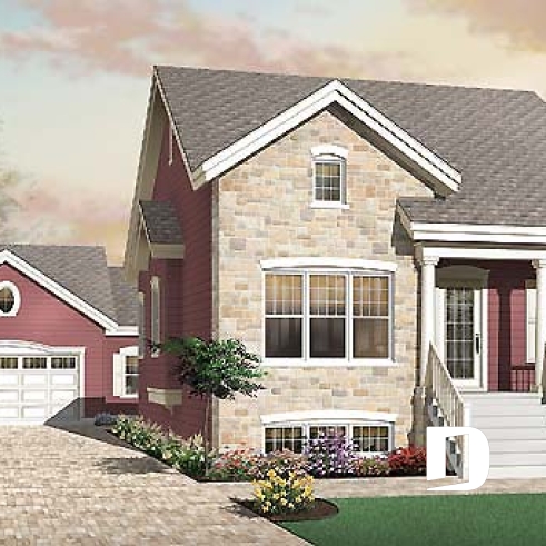 Toujours dans cette lignée de nouveaux plain-pied, Dessins Drummond vous propose ici deux versions intérieures pour un extérieur quasiment semblable et passablement distinct. L’usage de brique-pierre à la base de celui-ci et sur un mur-pignon, en façade, combiné à un déclin champêtre et un escalier fort invitant, confère à ce modèle un cachet plutôt unique. Fait à noter ici : avec la façon dont DDI réalise ses plans, il est facile de prolonger le parement léger extérieur ( en l’occurrence ce déclin bourgogne ) sans complication et par dessus la fondation, pour amplifier la maison, la rendre davantage esthétique et éviter l’application d’agrégat.