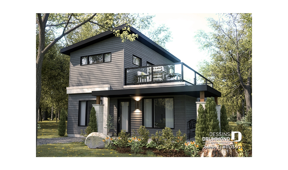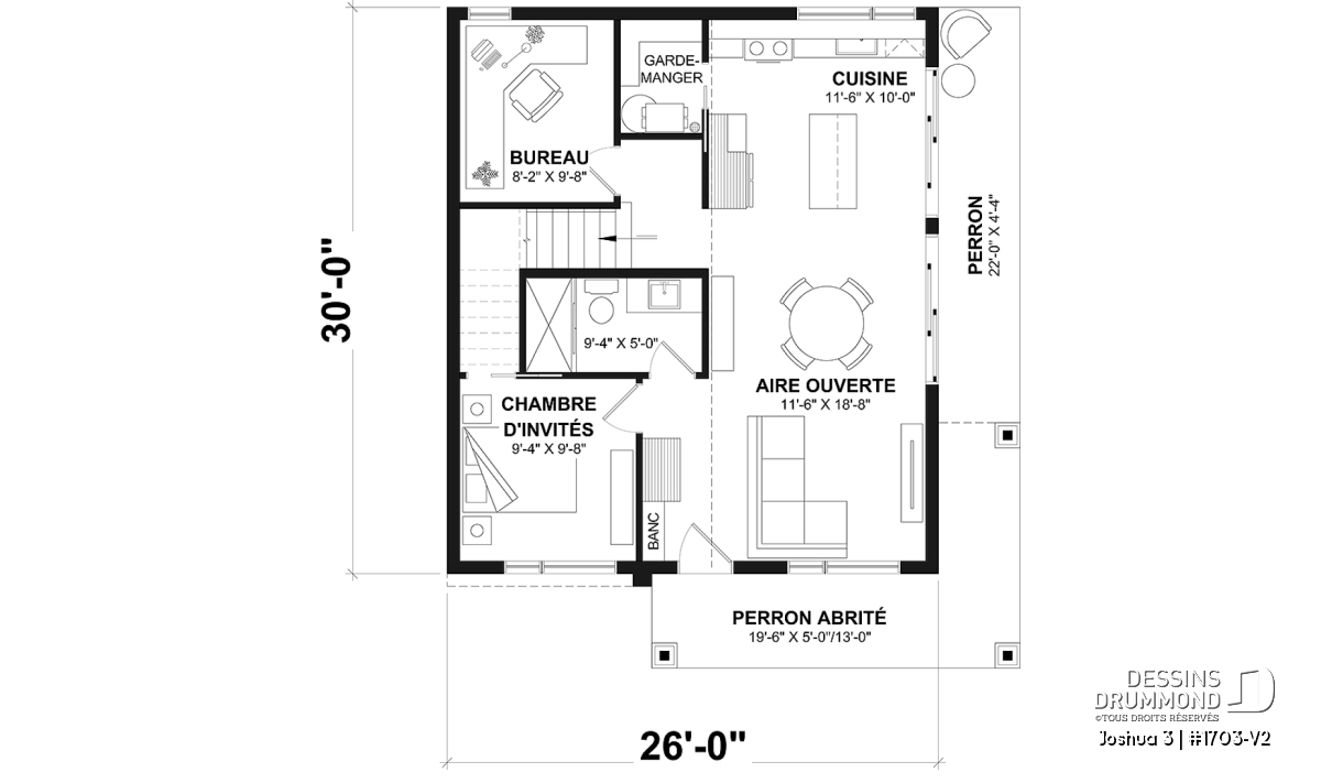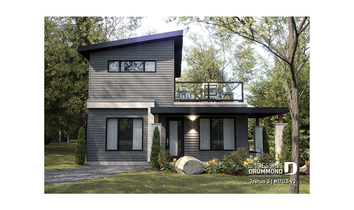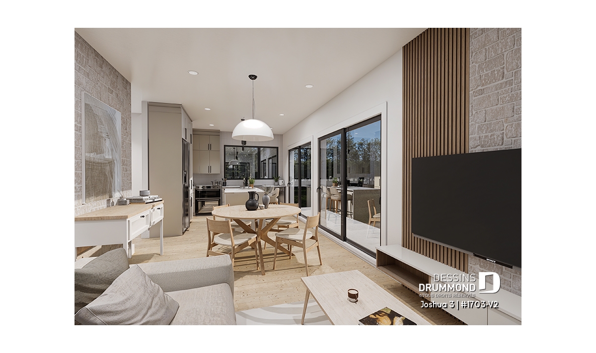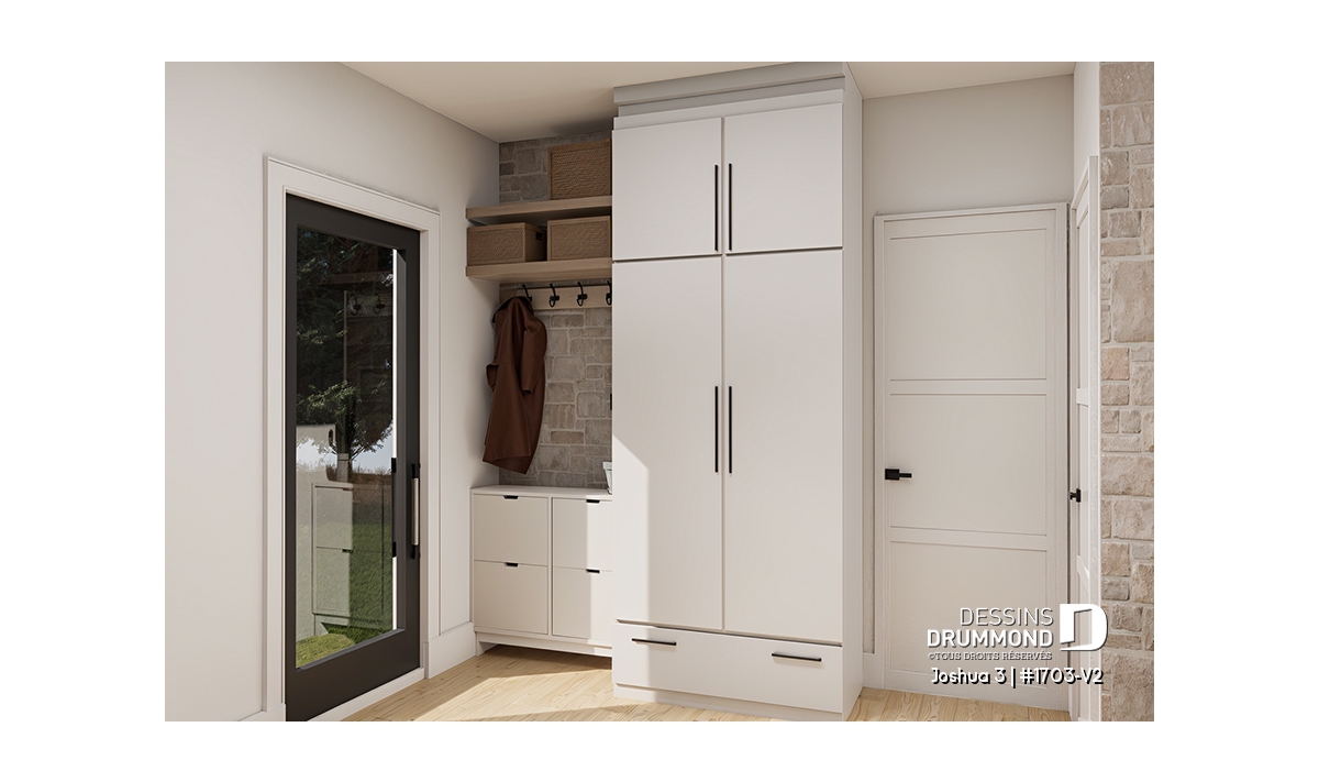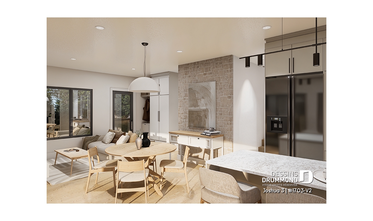 Le plan de maison Joshua 3 (1703-V2) propose une surface habitable de 1200pi2. La hauteur de tous les plafonds est de 8pi. La fondation prévue est une dalle flottante, bien que d'autres options de fondation sont disponibles.