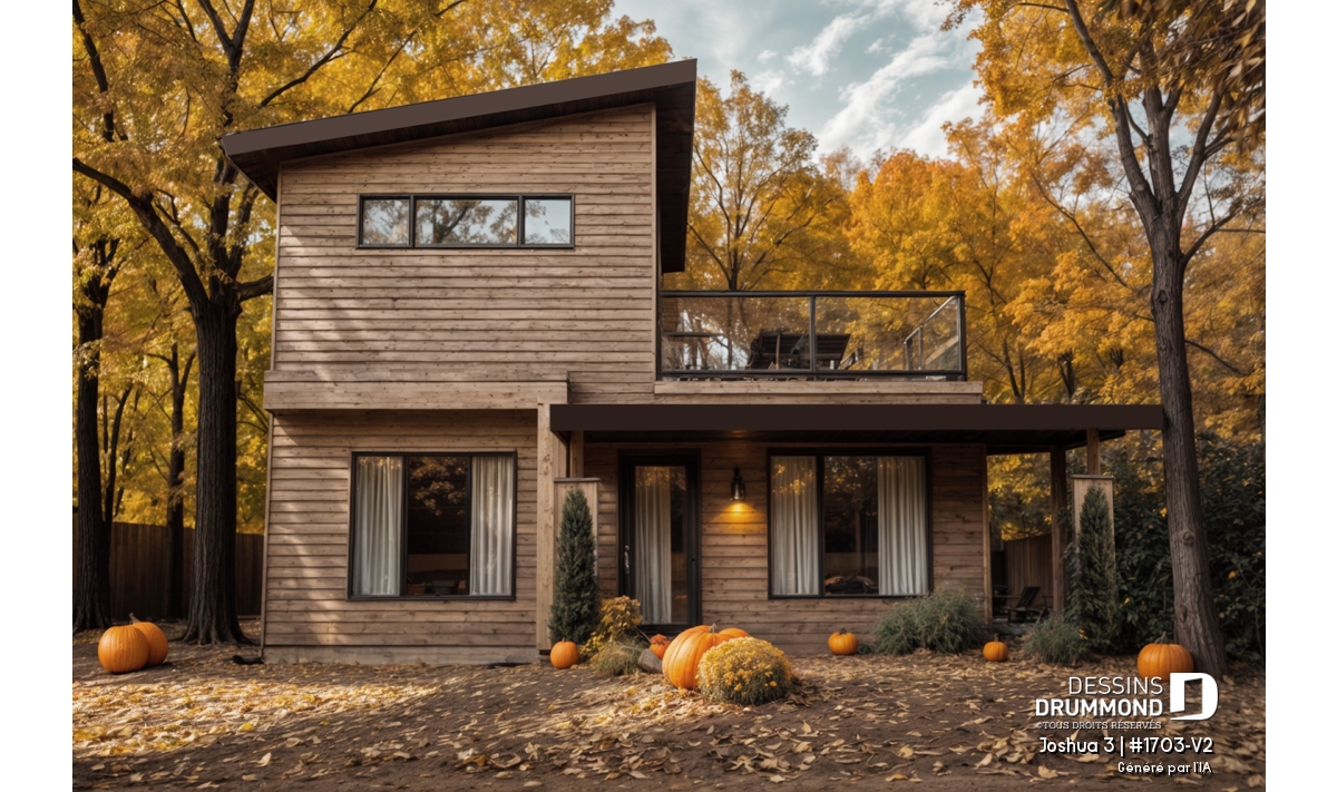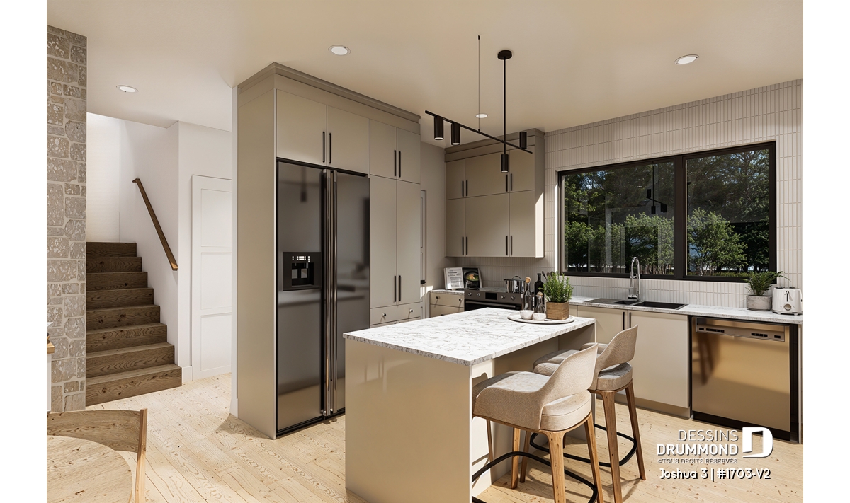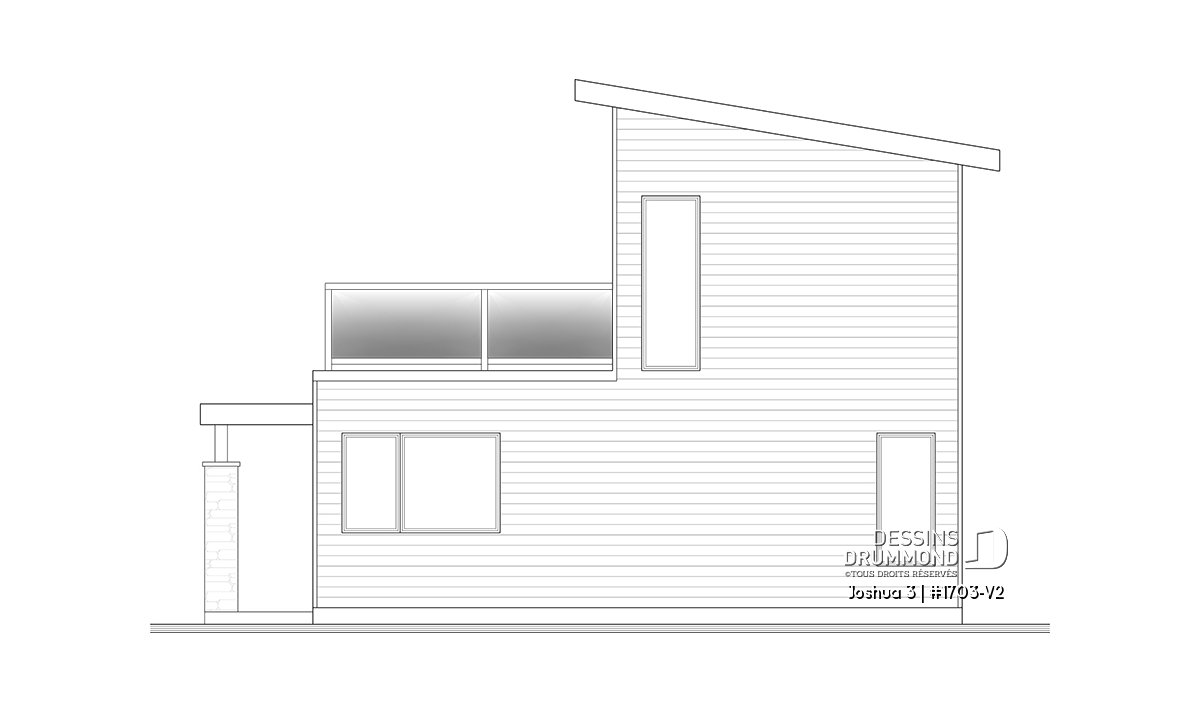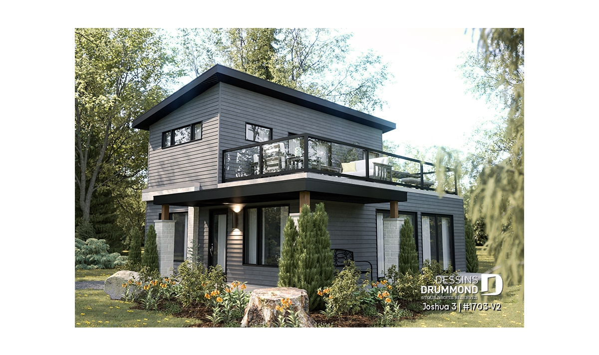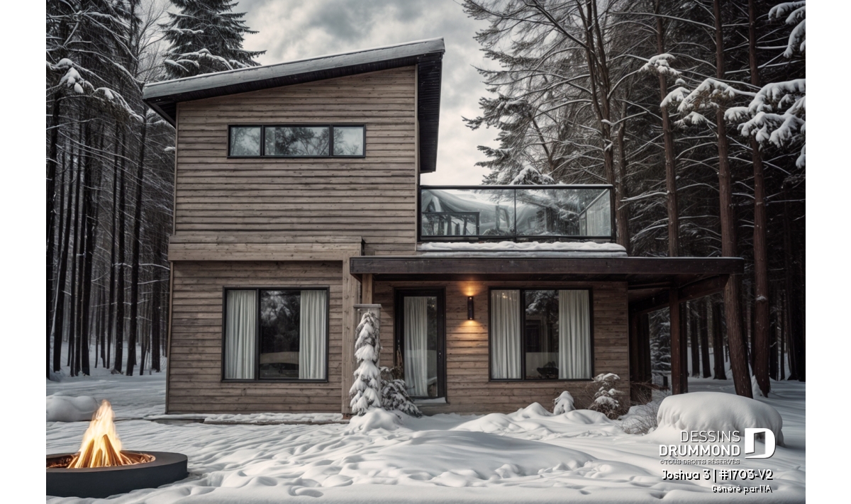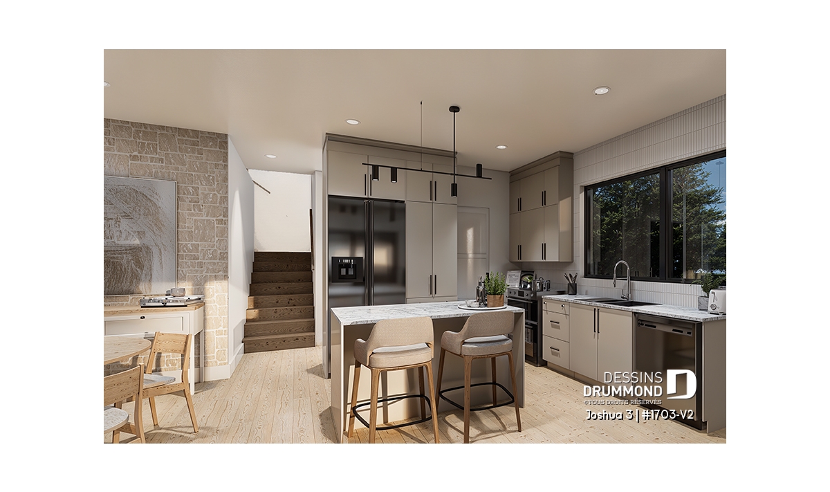 Le plan de maison Joshua 3 (1703-V2) propose une surface habitable de 1200pi2. La hauteur de tous les plafonds est de 8pi. La fondation prévue est une dalle flottante, bien que d'autres options de fondation sont disponibles.