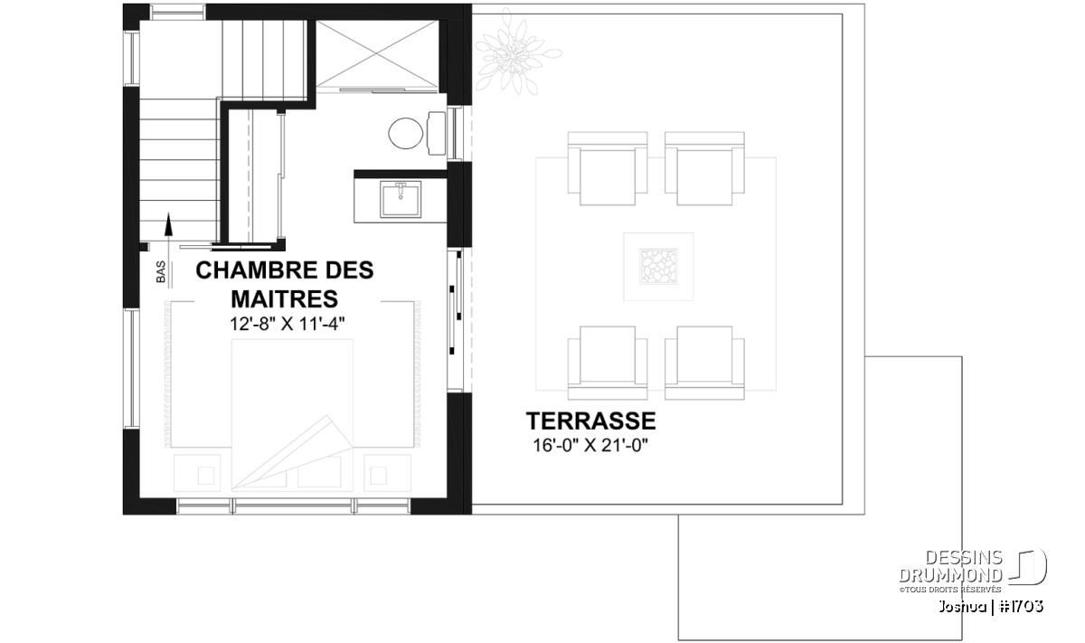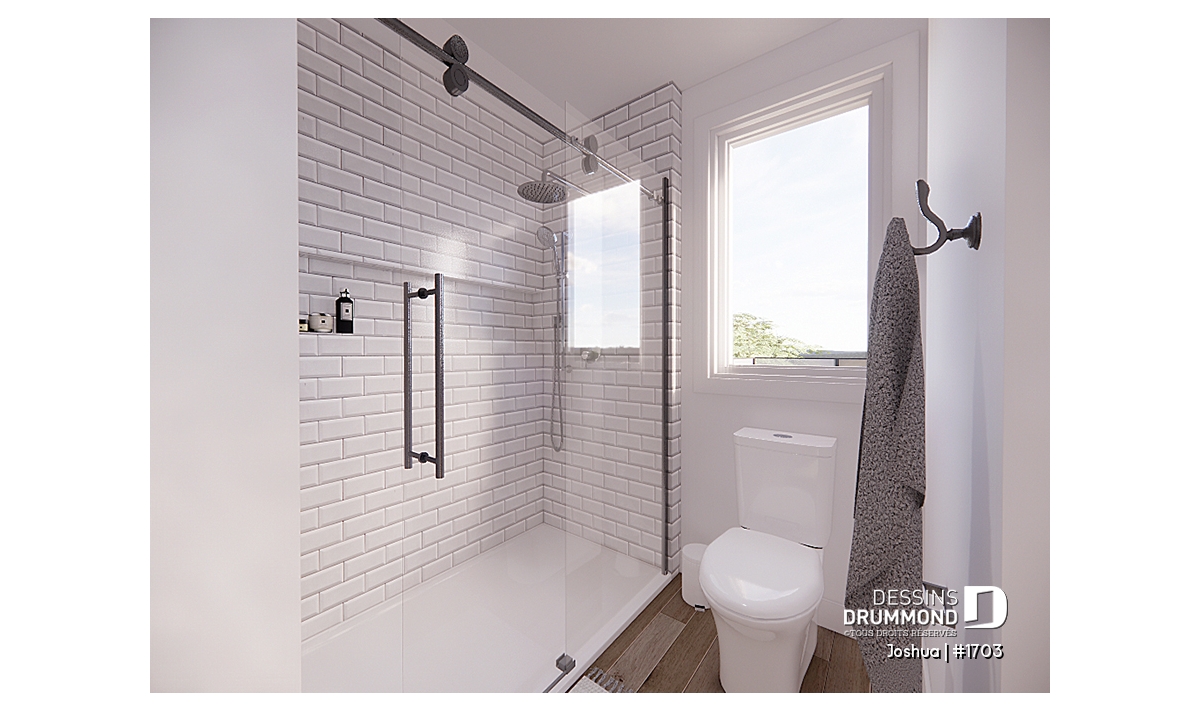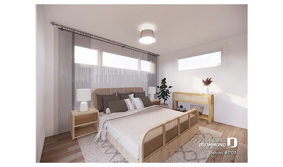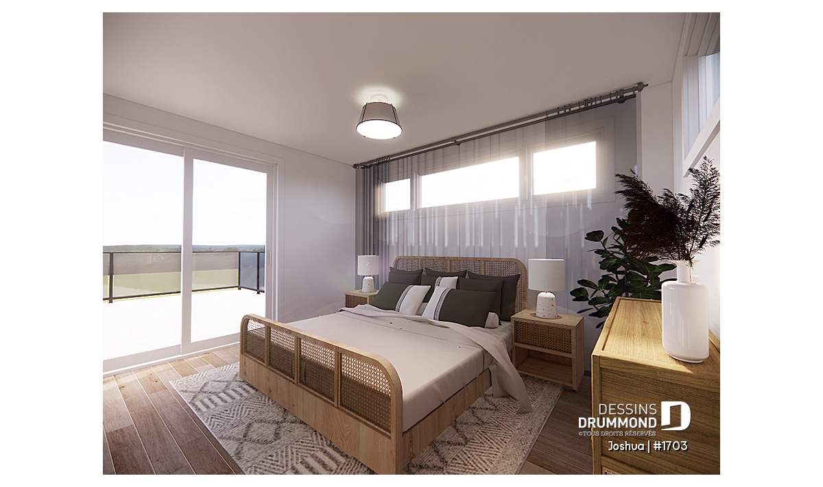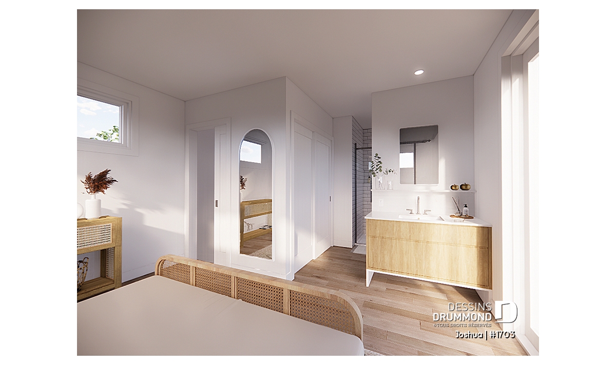 À l’étage, la suite principale s’impose comme un véritable refuge privé. Occupant tout le niveau, elle propose une salle de douche élégante et un accès direct à une grande terrasse extérieure grâce à une porte-patio. Cet espace extérieur devient rapidement un lieu de détente privilégié, parfait pour un café matinal ou un moment de lecture au soleil.
