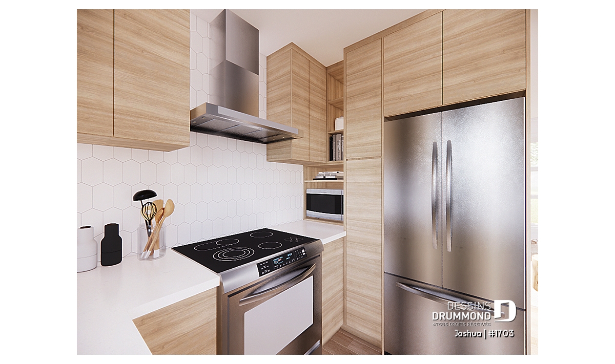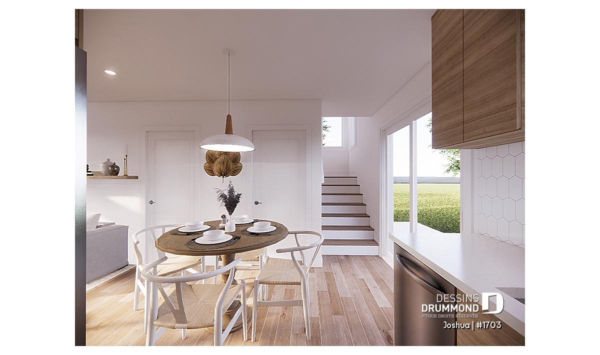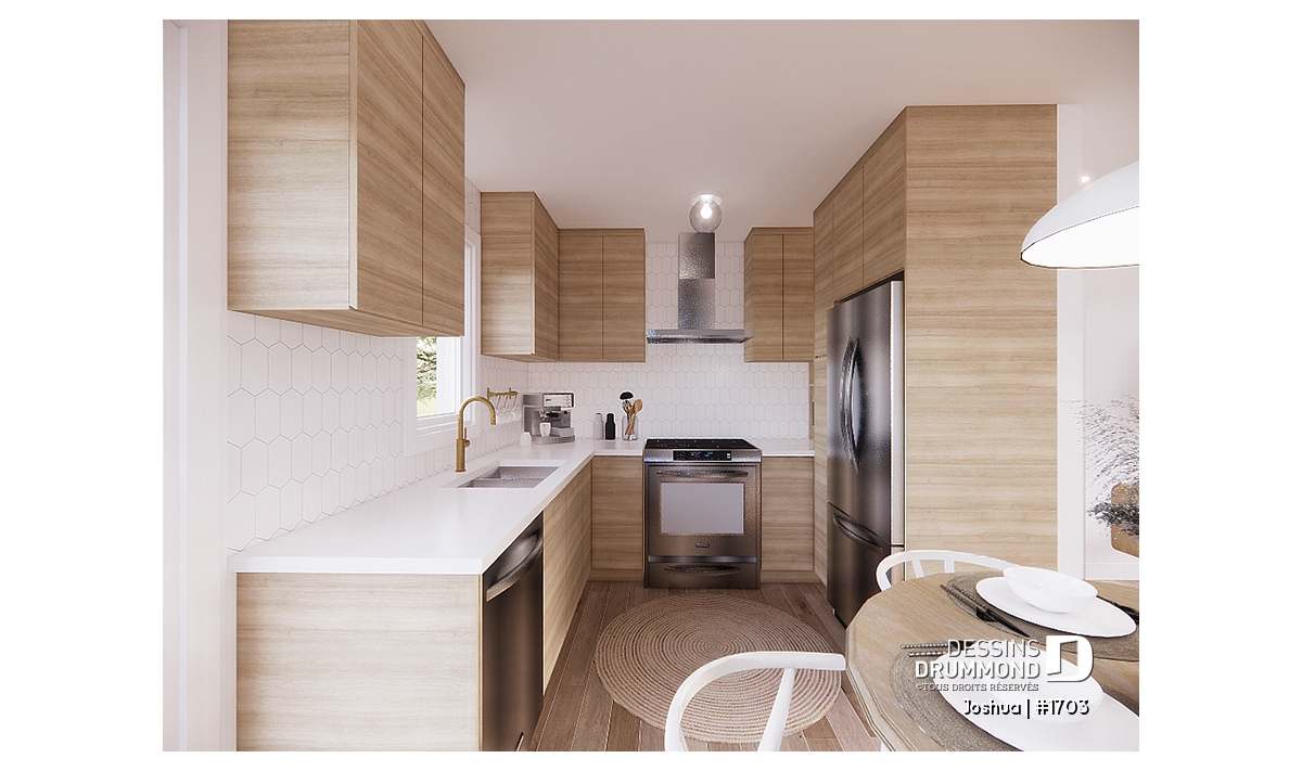 La cuisine fonctionnelle séduit par sa disposition efficace et sa porte-patio donnant sur la cour arrière, parfaite pour accéder à la terrasse ou au jardin. Tout près, un coin salle de lavage discret accueille laveuse et sécheuse superposées, maximisant ainsi l’espace disponible.