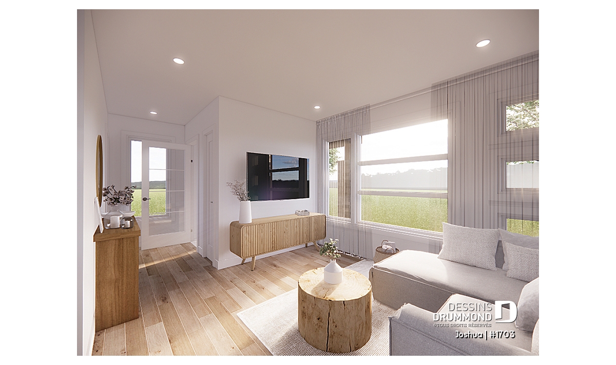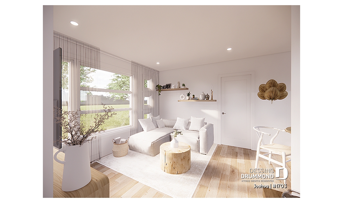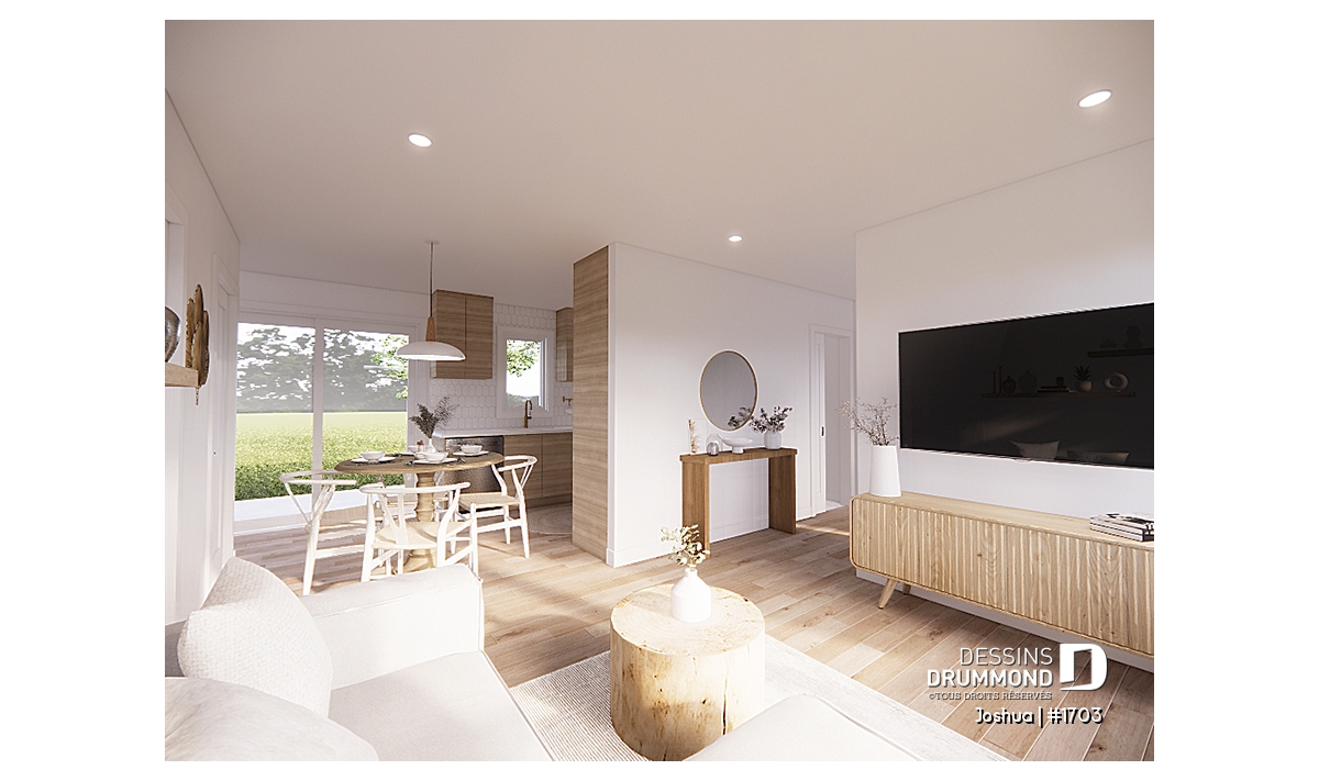Espace familial à aire ouverte, baigné de lumière naturelle grâce à une fenestration abondante.