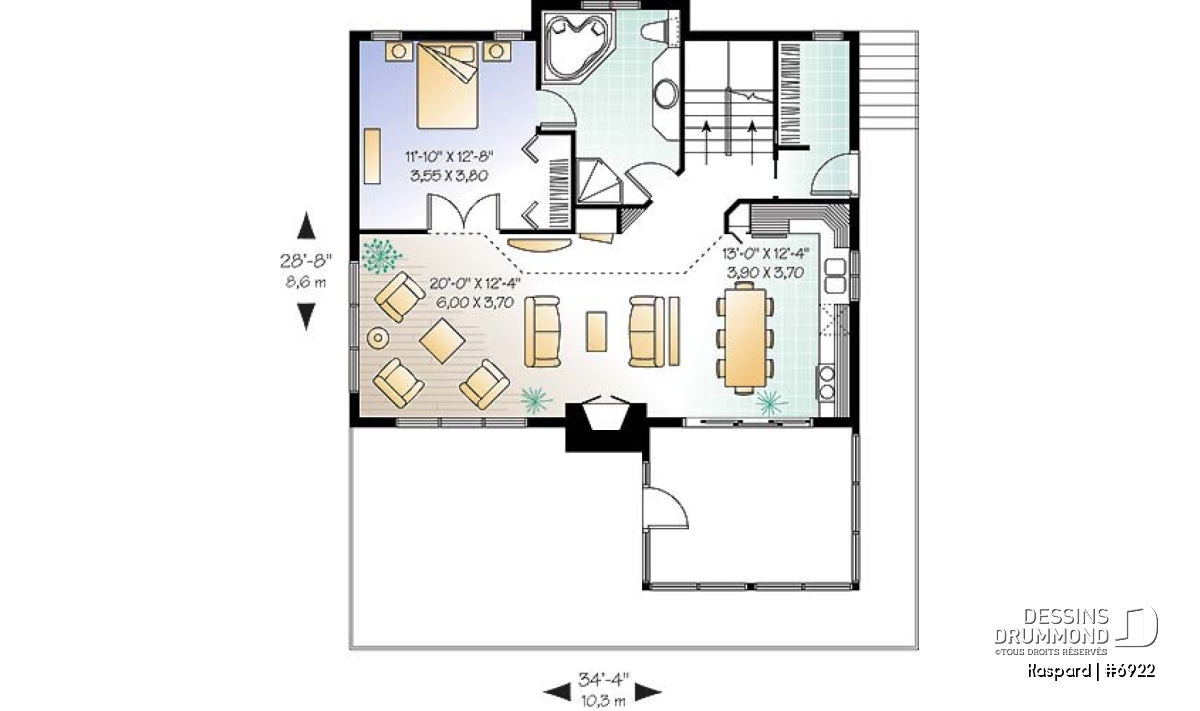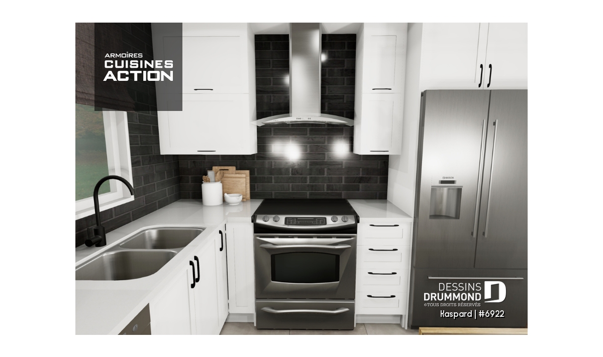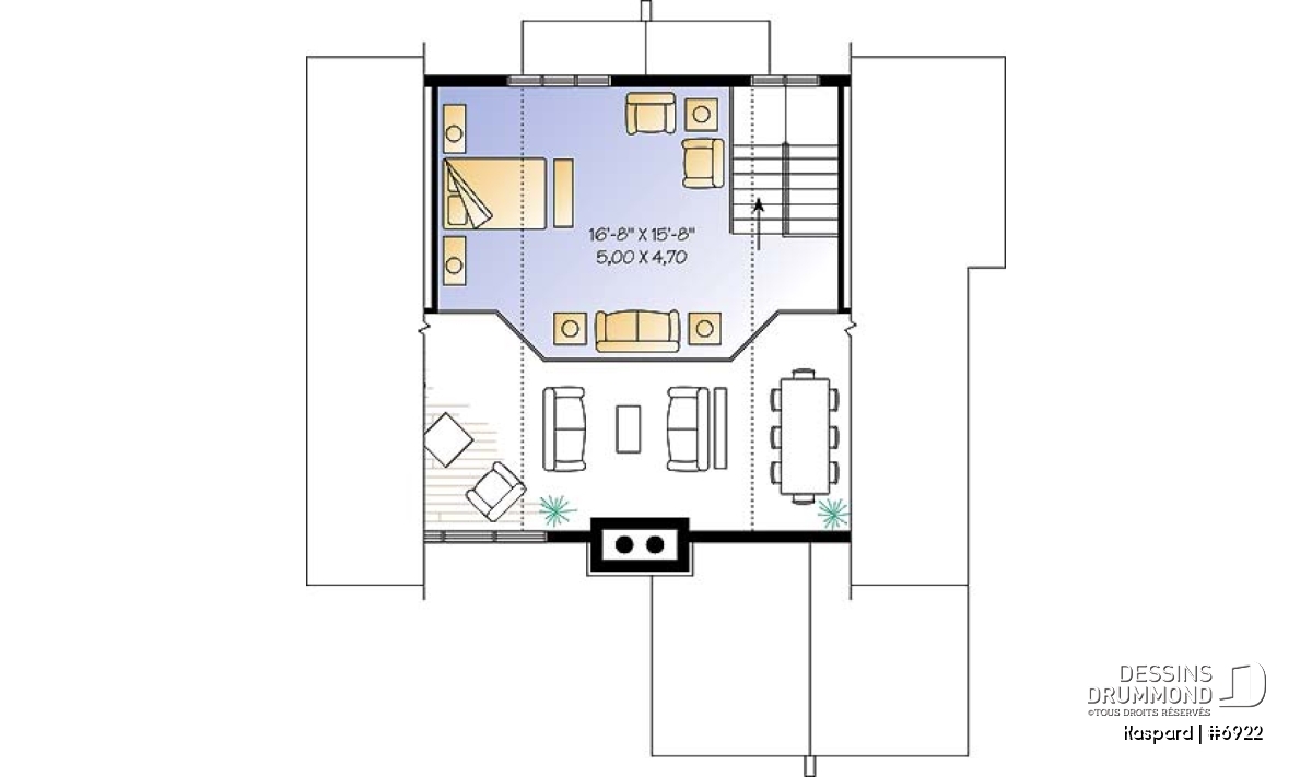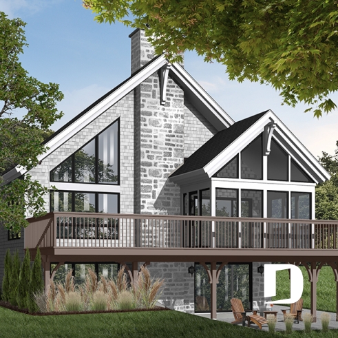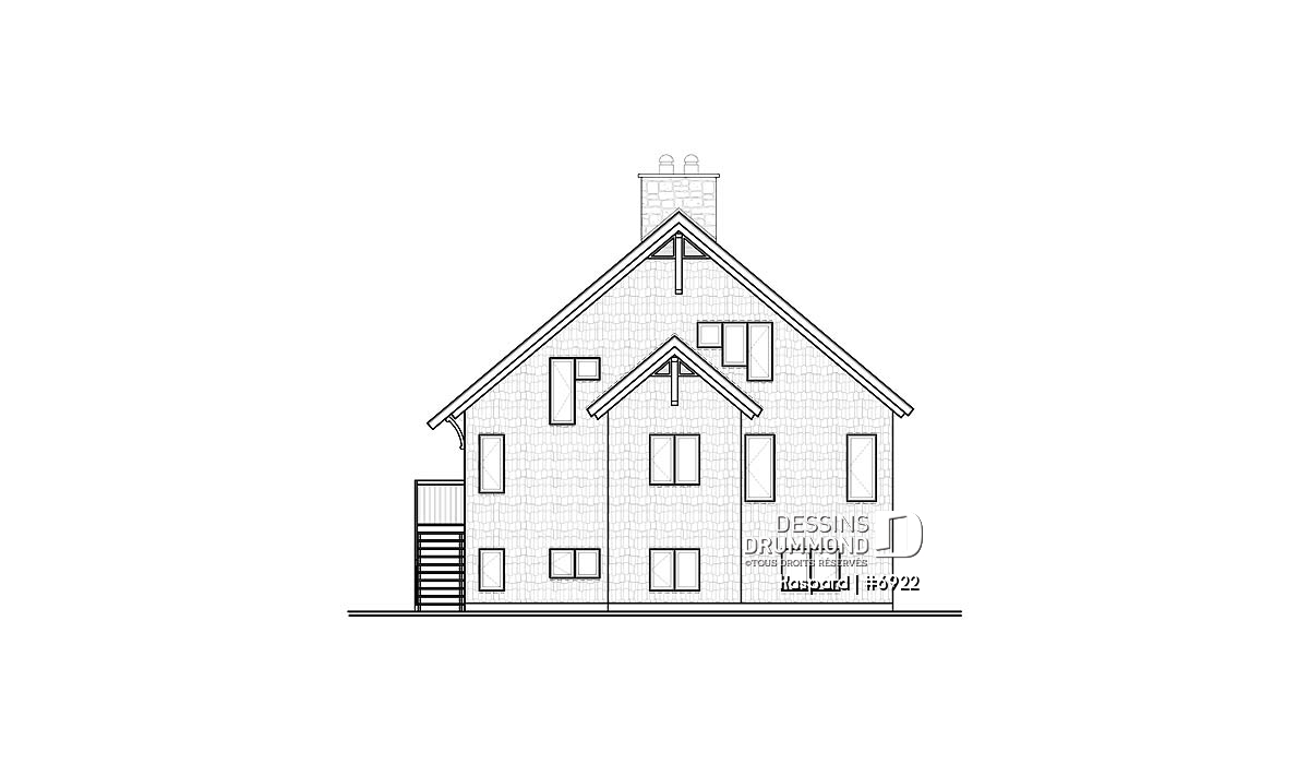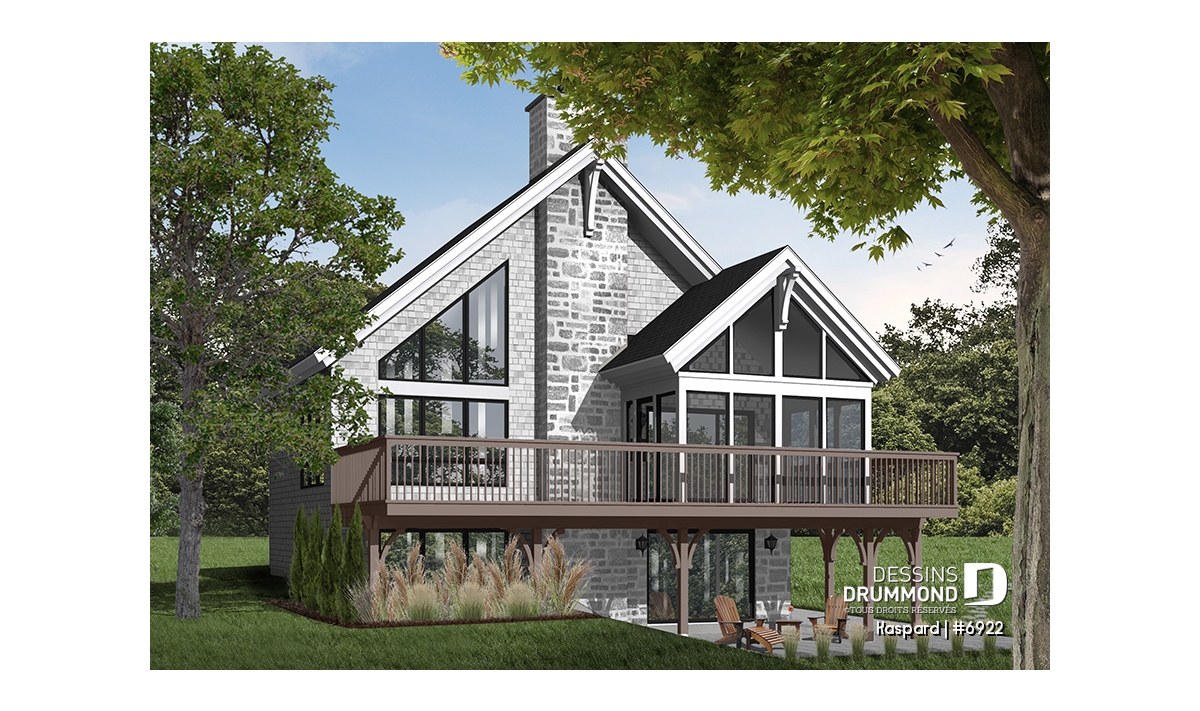 Issu des très populaires plans de chalet Dessins Drummond # 2908, # 2942 et surtout # 2915 (qu’il vous est possible de voir sur le site dessinsdrummond.com) celui-ci se veut une version encore plus confortable avec 225 pieds carrés de plus, répartis sur les trois planchers, une terrasse encore plus logeable et un abri moustiquaire de plus en plus convoité.
