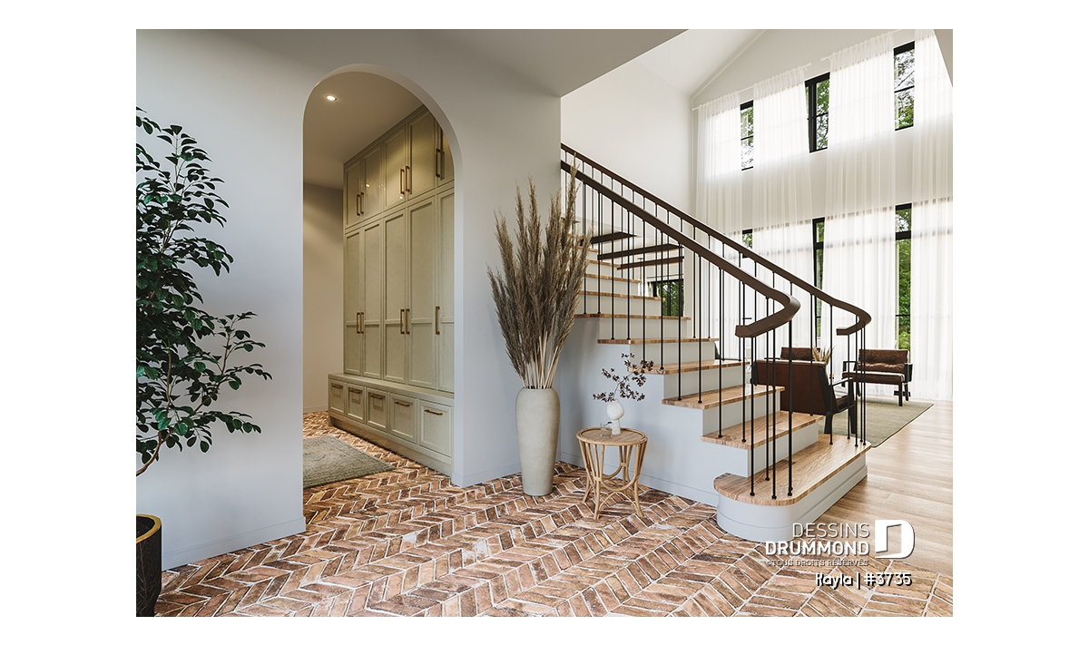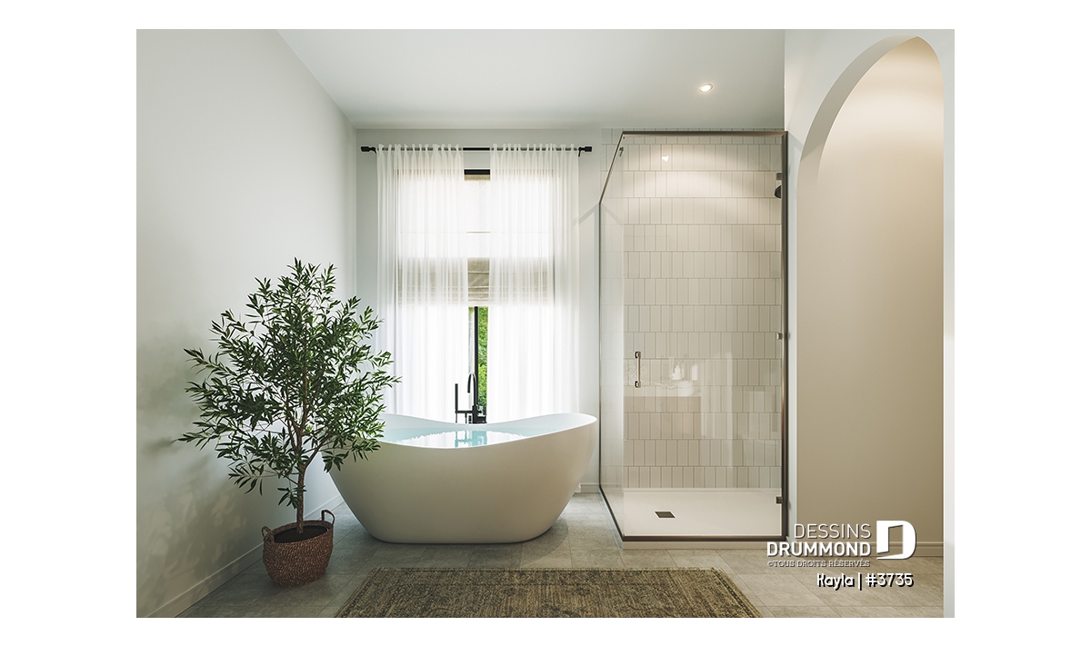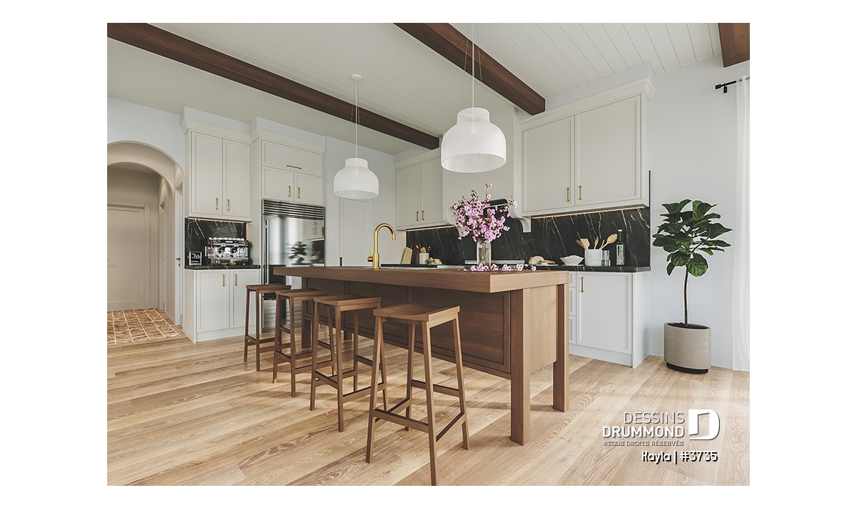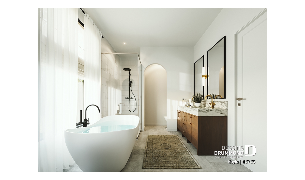 Aire ouverte, Bureau / Salle étude, Chambres séparées, Foyer, Garde-manger, Ilôt, Plafond cathédrale, Salle de lavage au rez-de-chaussée, Suite des maîtres au rdc, Vestiaire, Walk-in ch. maîtres, Plafond à plus de 8', Banquette, Bain et douche séparés, Lavabo double, Meuble(s) encastré(s), Tablettes, Arche