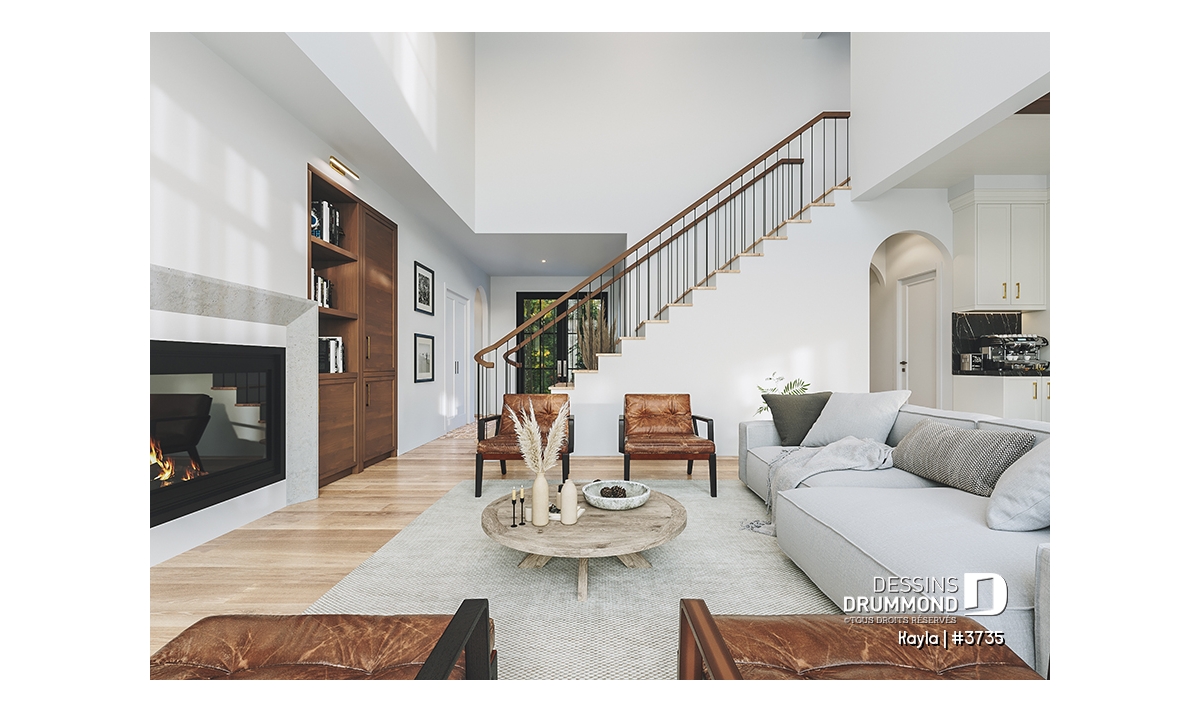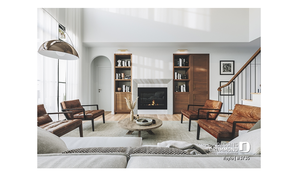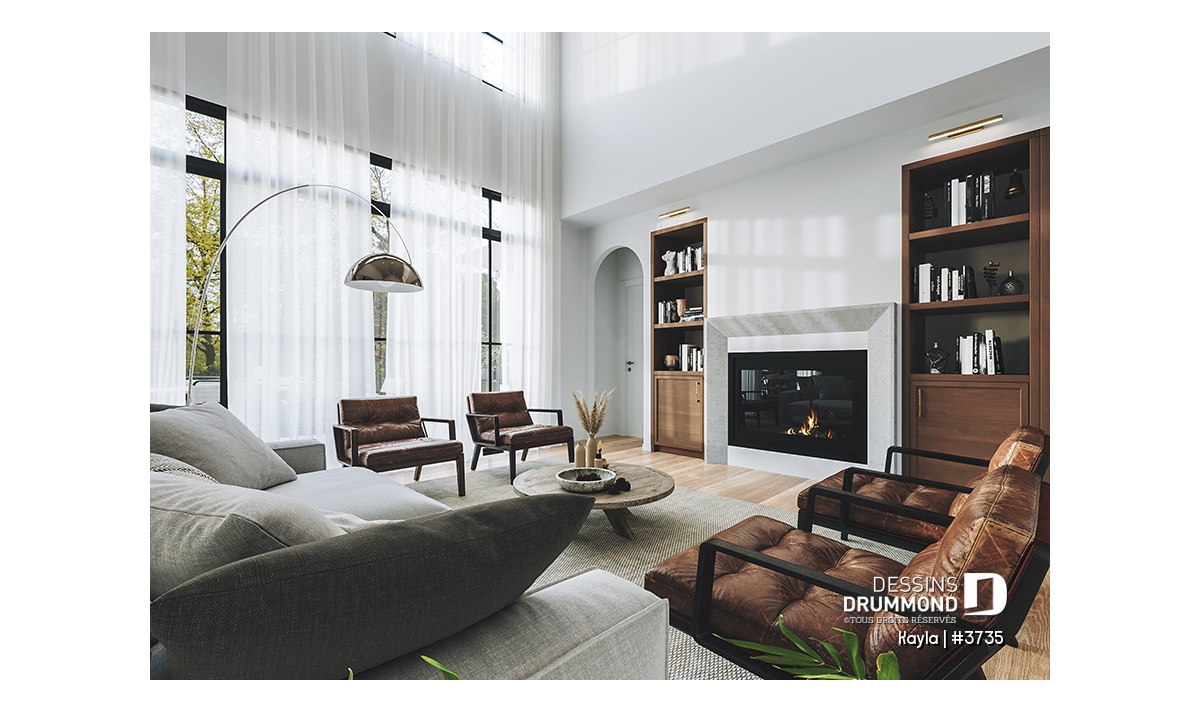 Salle de séjour avec plafond ouvert sur 2 étages et possédant un foyer ainsi que du mobilier intégré de chaque côté.