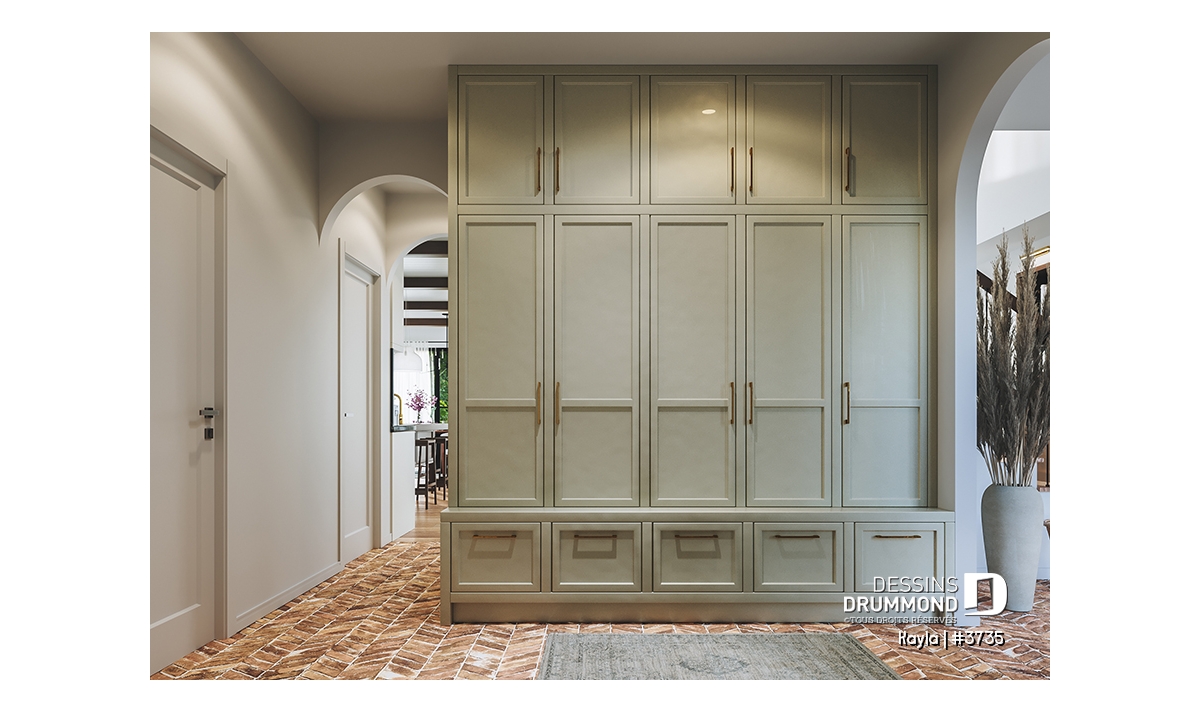 Vestiaire centré entre l'entrée principale avant et l'entrée du garage.