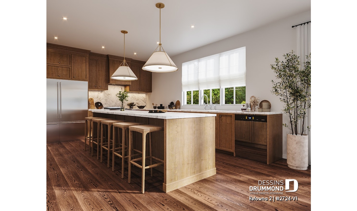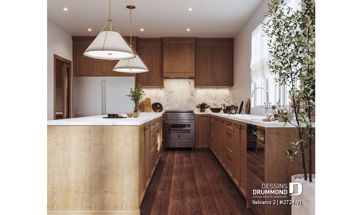 Cuisine avec garde-manger, grand îlot et ouverte sur la salle à manger.
