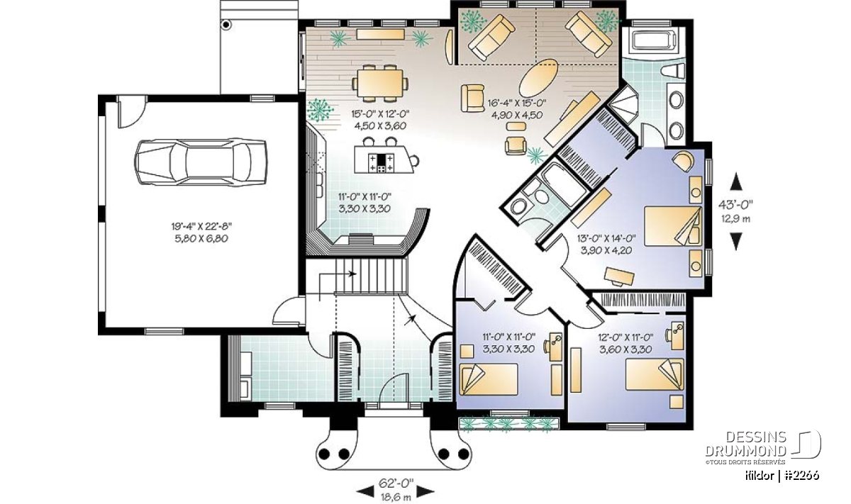 Plan plain-pied avec 3 chambres, garage double, à aire ouverte, guanderie, grande chambre des parents