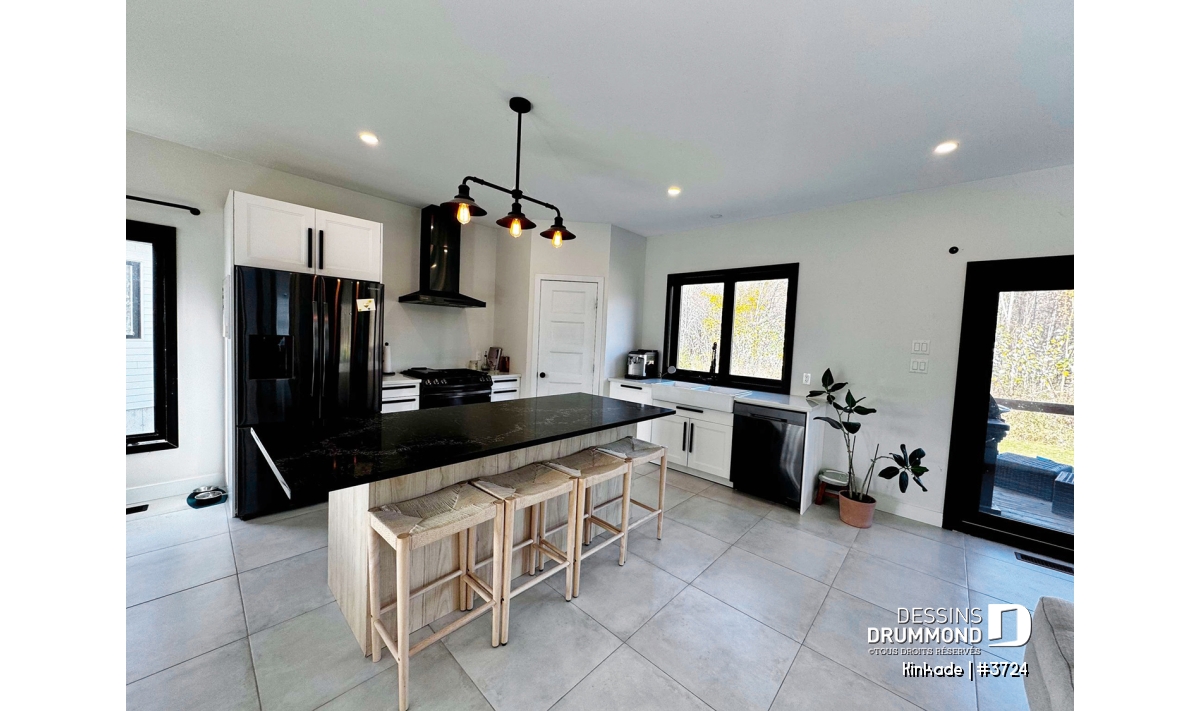 Cuisine avec garde-manger et grand îlot pouvant accueillir 4 invités.